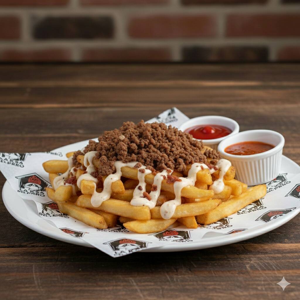 Orden de papas a la francesa con bites de carne de res y aderezo de tocino y salsas. (Imagen ilustrativas)