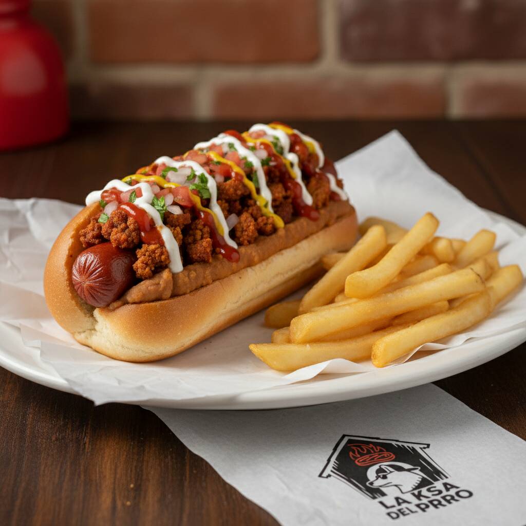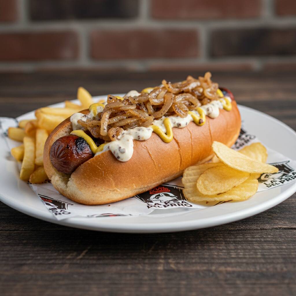 Pan, aderezo de la Ksa, salchicha de res, cebolla caramelizada, mostaza golden y papas fritas sabor queso tipo chips. (Imagen ilustrativa)