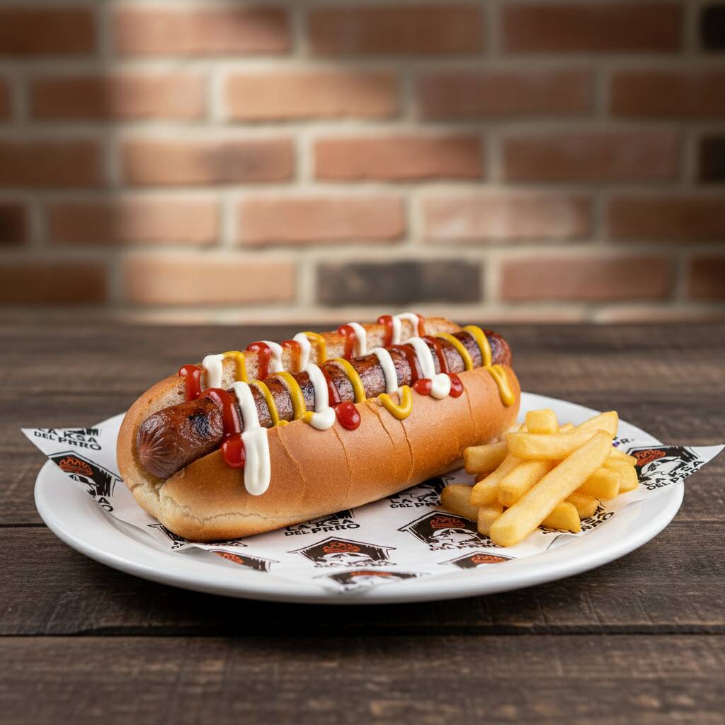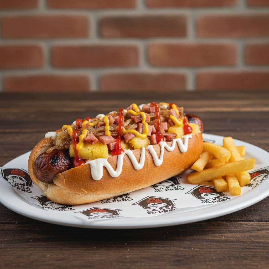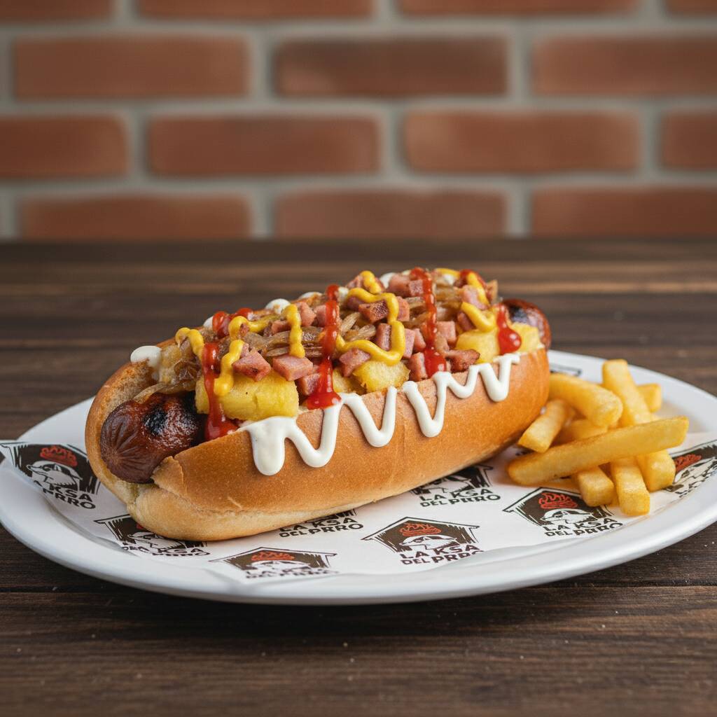 Pan, aderezo de la Ksa, salchicha de res, salsa golden-habanero, jamón, cebolla caramelizada, catsup y mostaza. (Imagen ilustrativa)