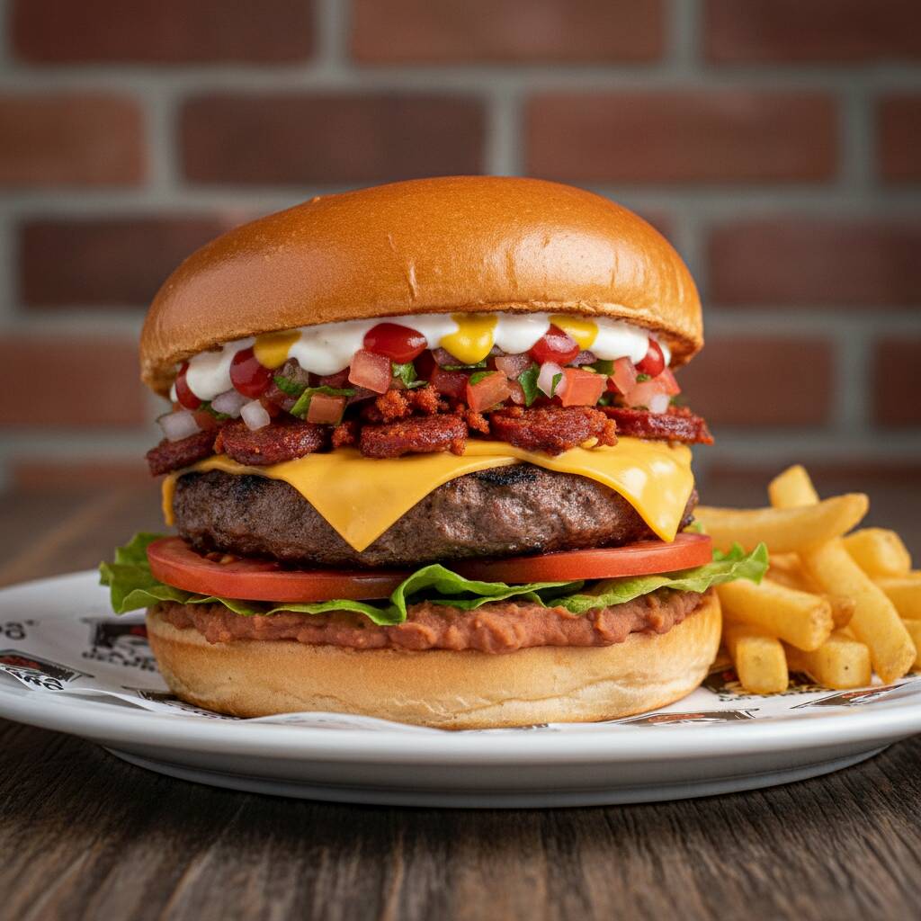 Pan brioche, salsa mordiscos, carne de res, queso, frijoles, pico de gallo, chorizo lechuga, rodajas de jitomate salsa catsup y mostaza. (Imagen ilustrativa)