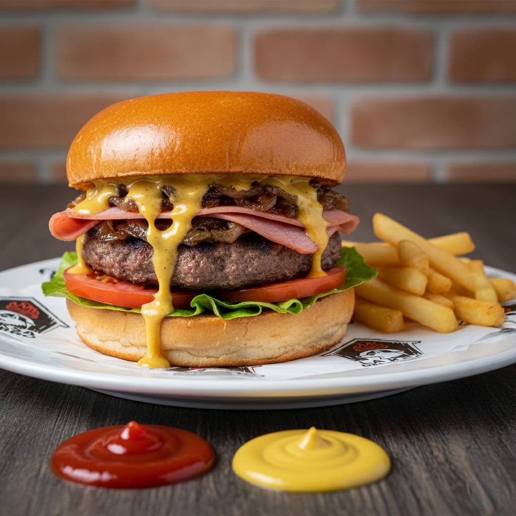 Pan brioche, salsa Golden-habanero, carne de res, jamón, cebolla caramelizada, lechuga, rodajas de jitomate, salsa catsup y mostaza. (Imagen ilustrativa)