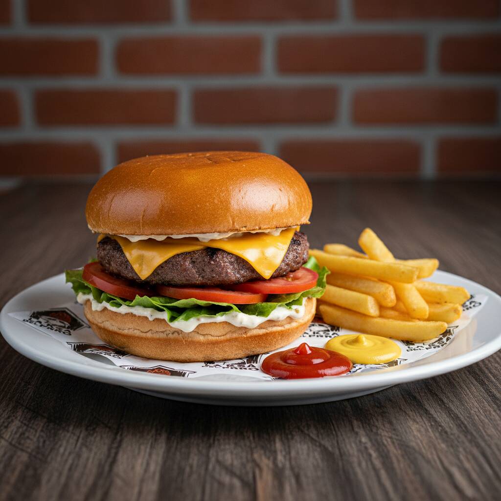 Pan brioche, aderezo de la Ksa, carne de res, queso, lechuga, rodajas de jitomate, salsas catsup y mostaza. (Imagen ilustrativa)