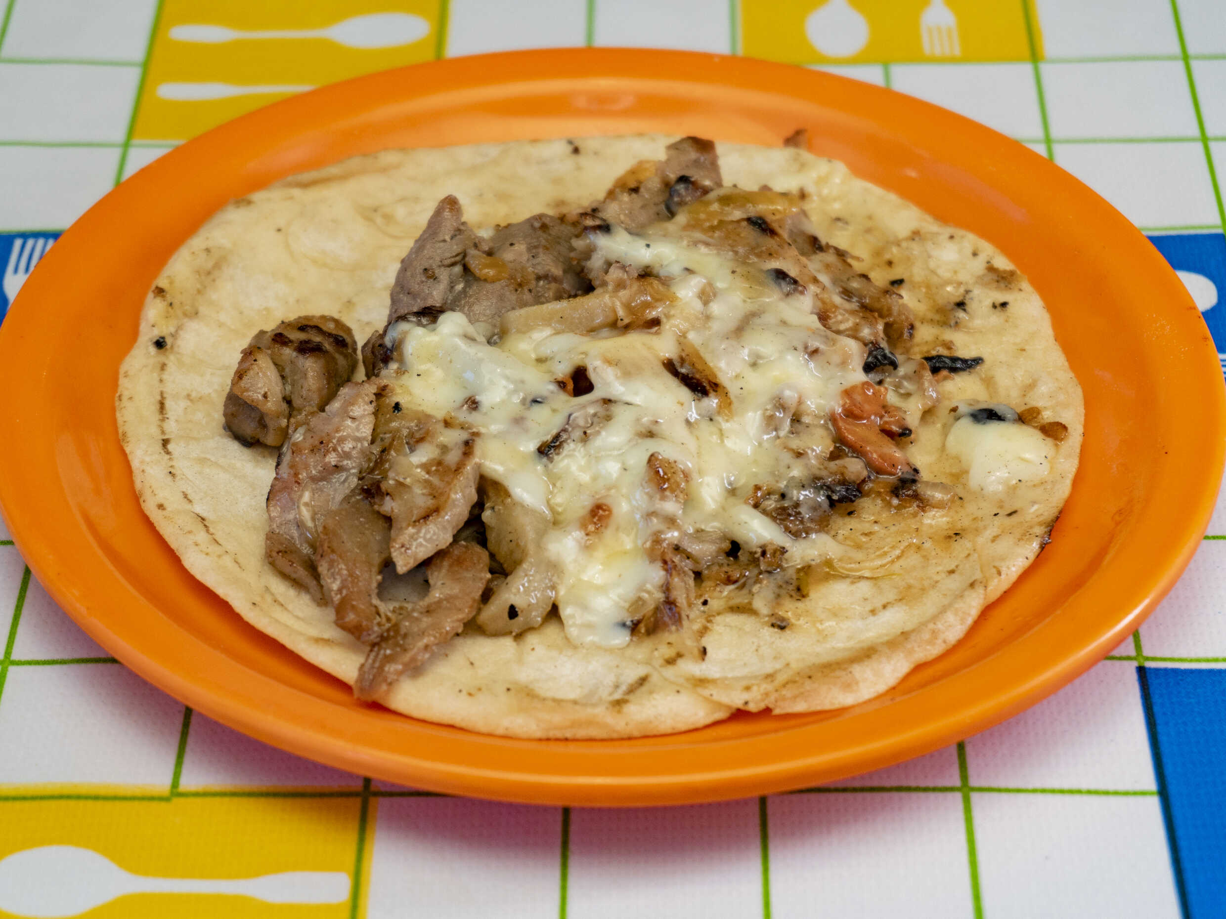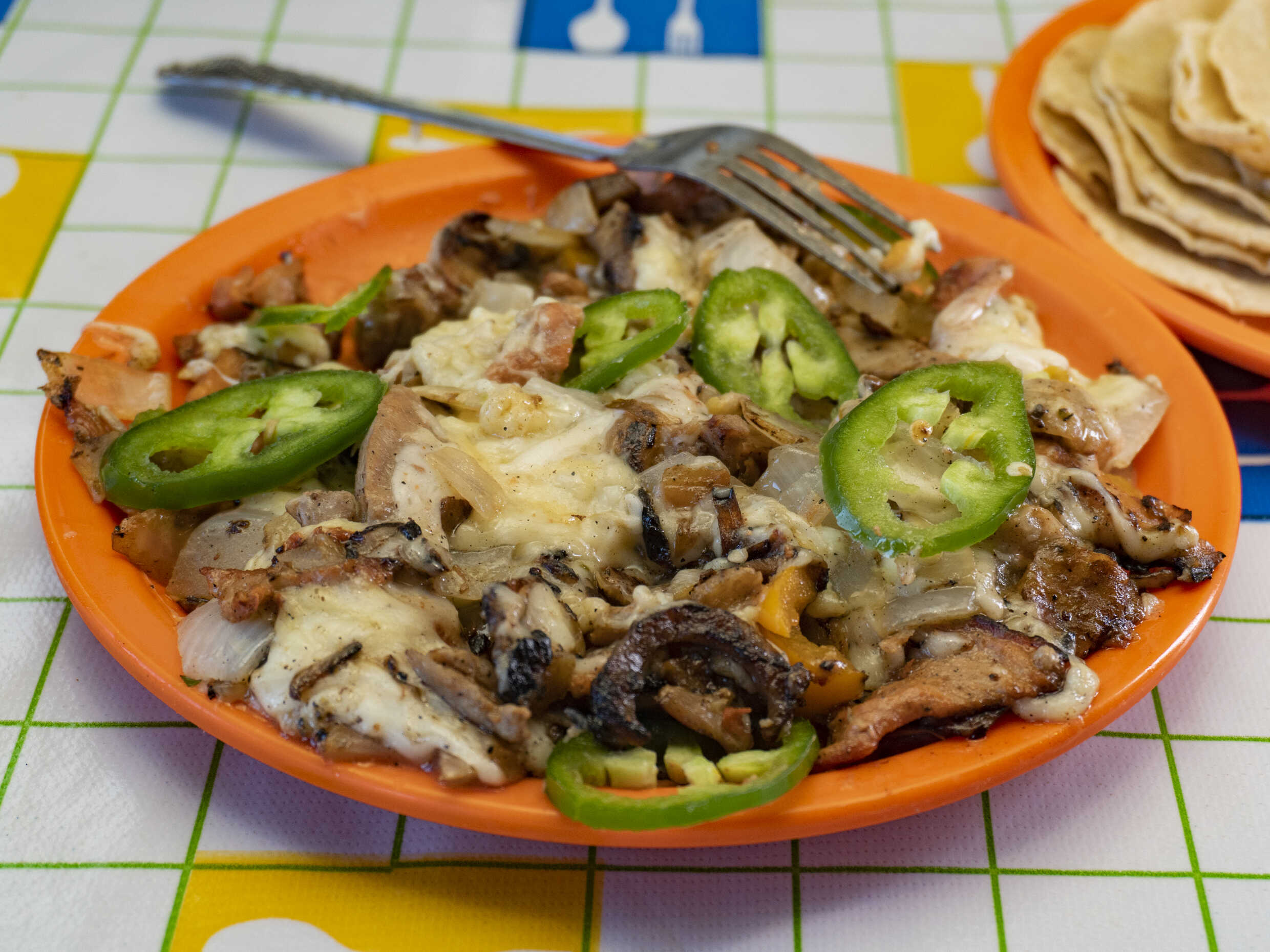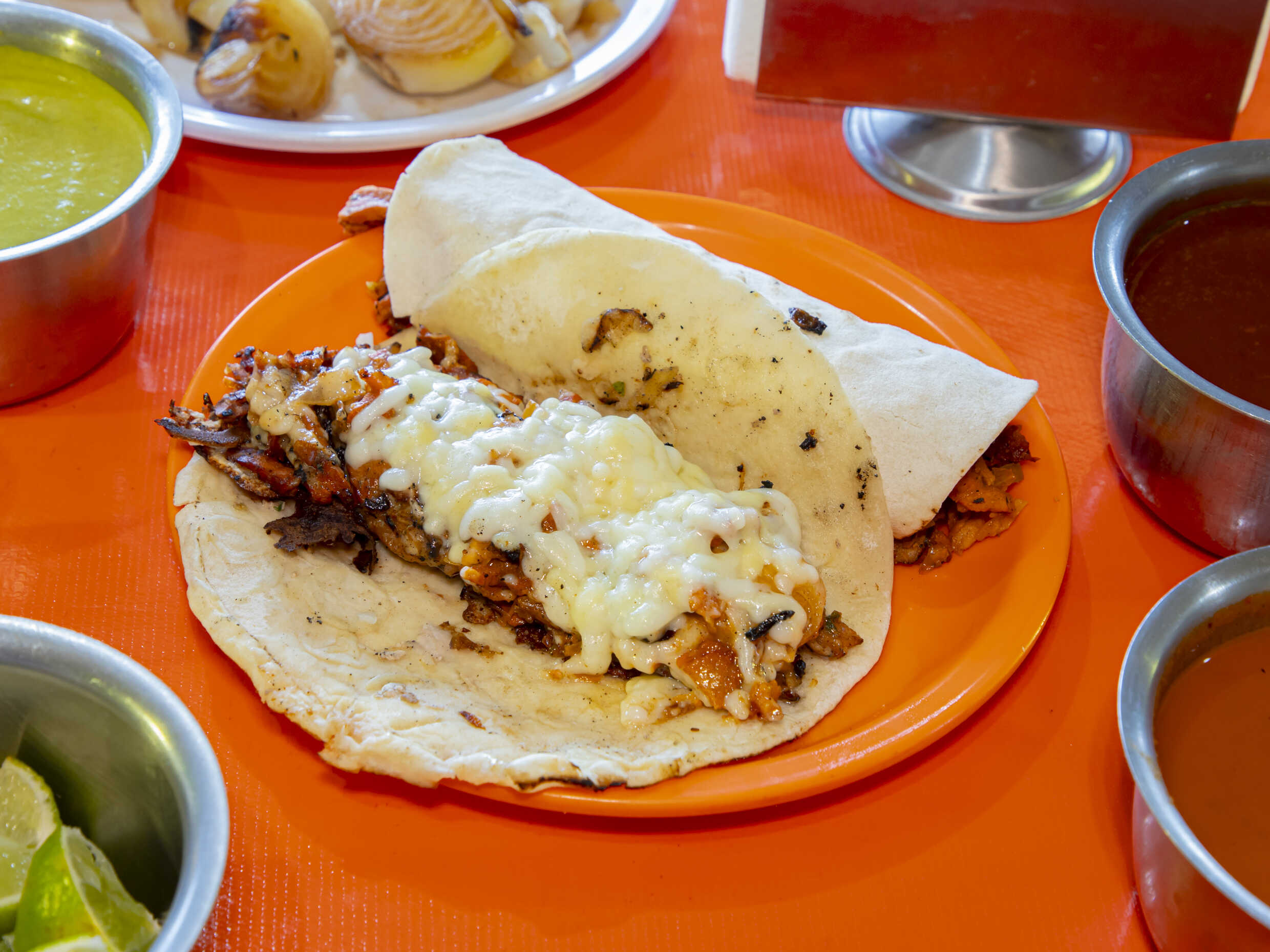 Bistec, carne al pastor, jalapeños, cebolla, tocino y queso.