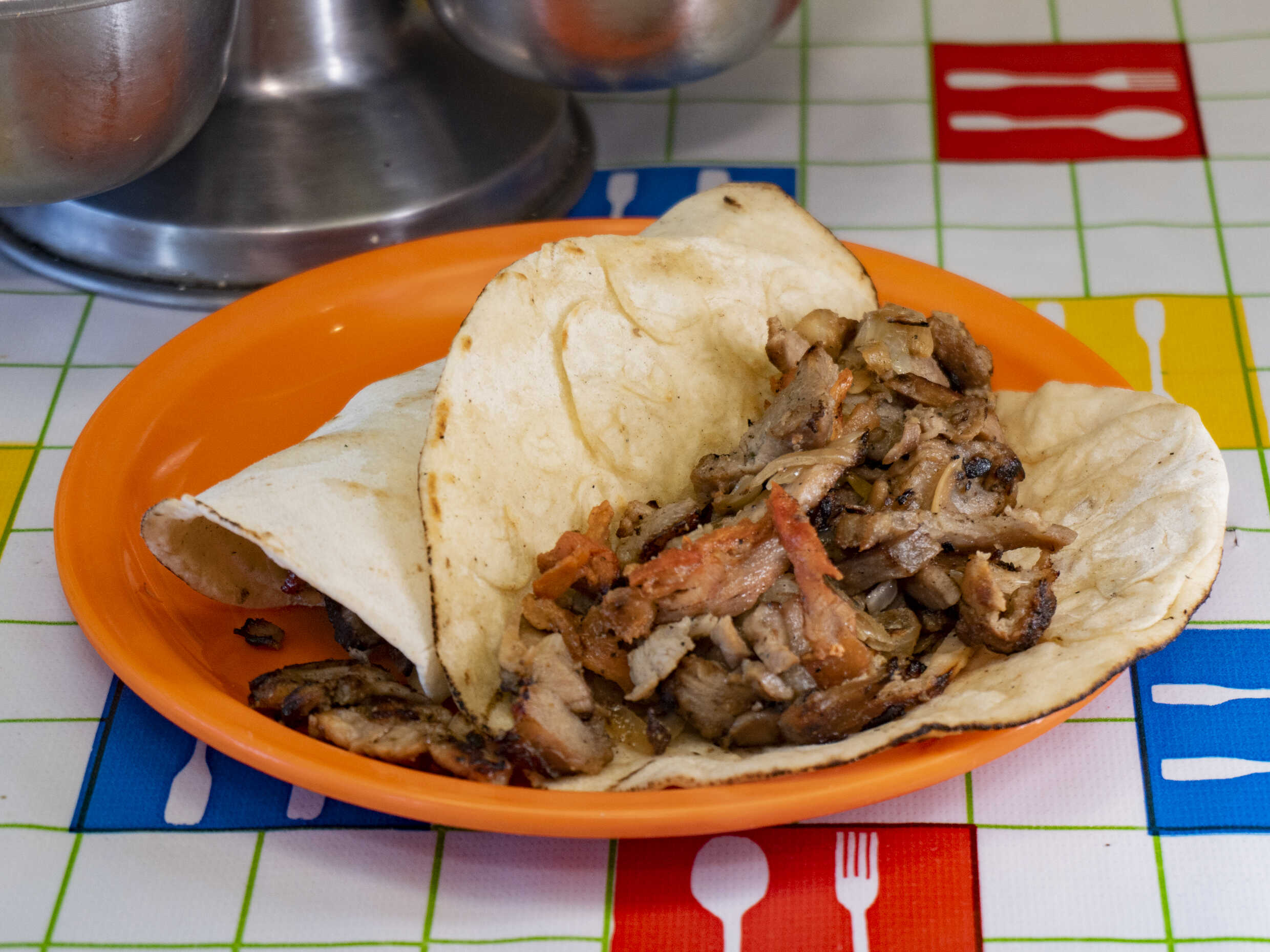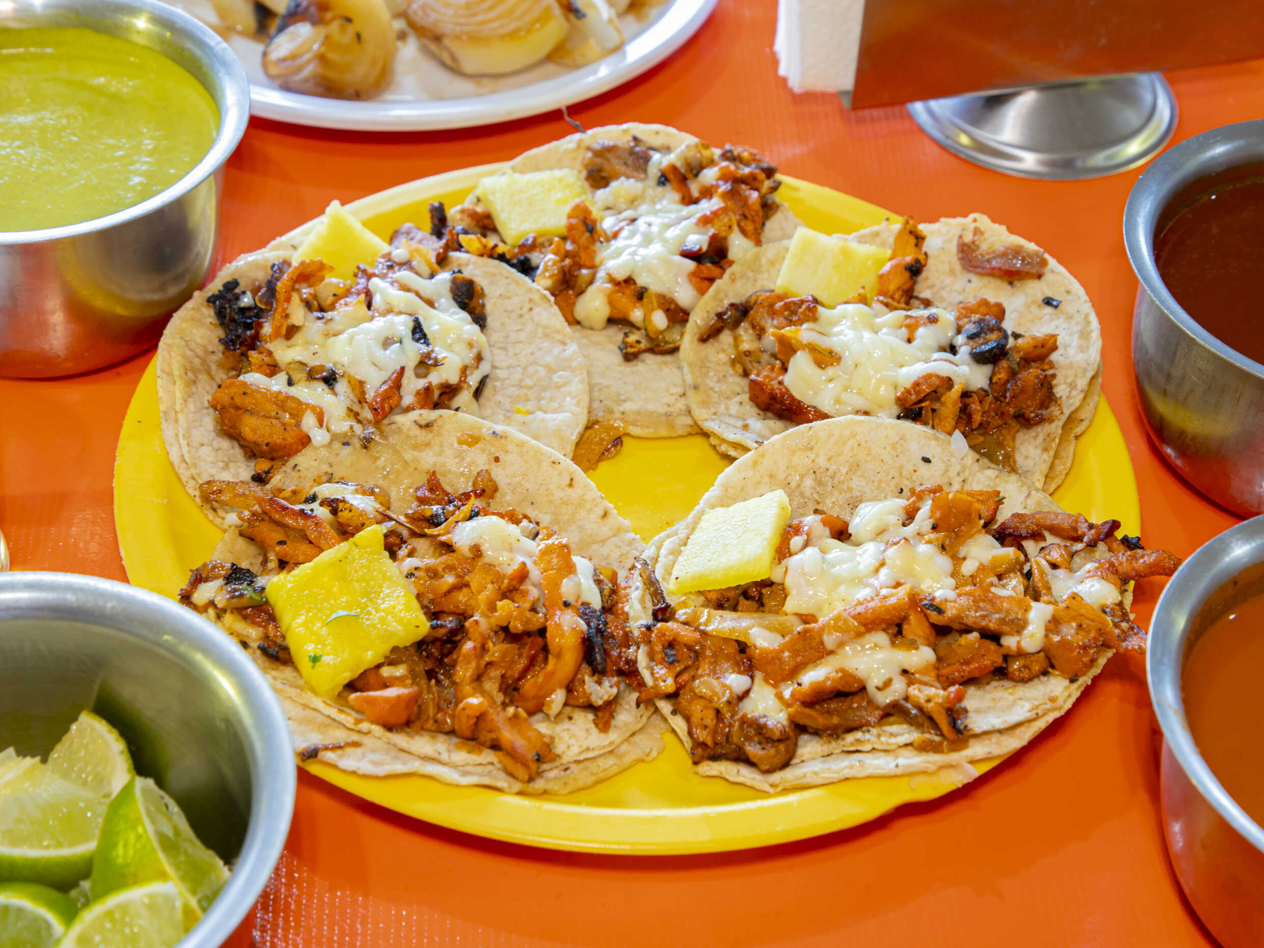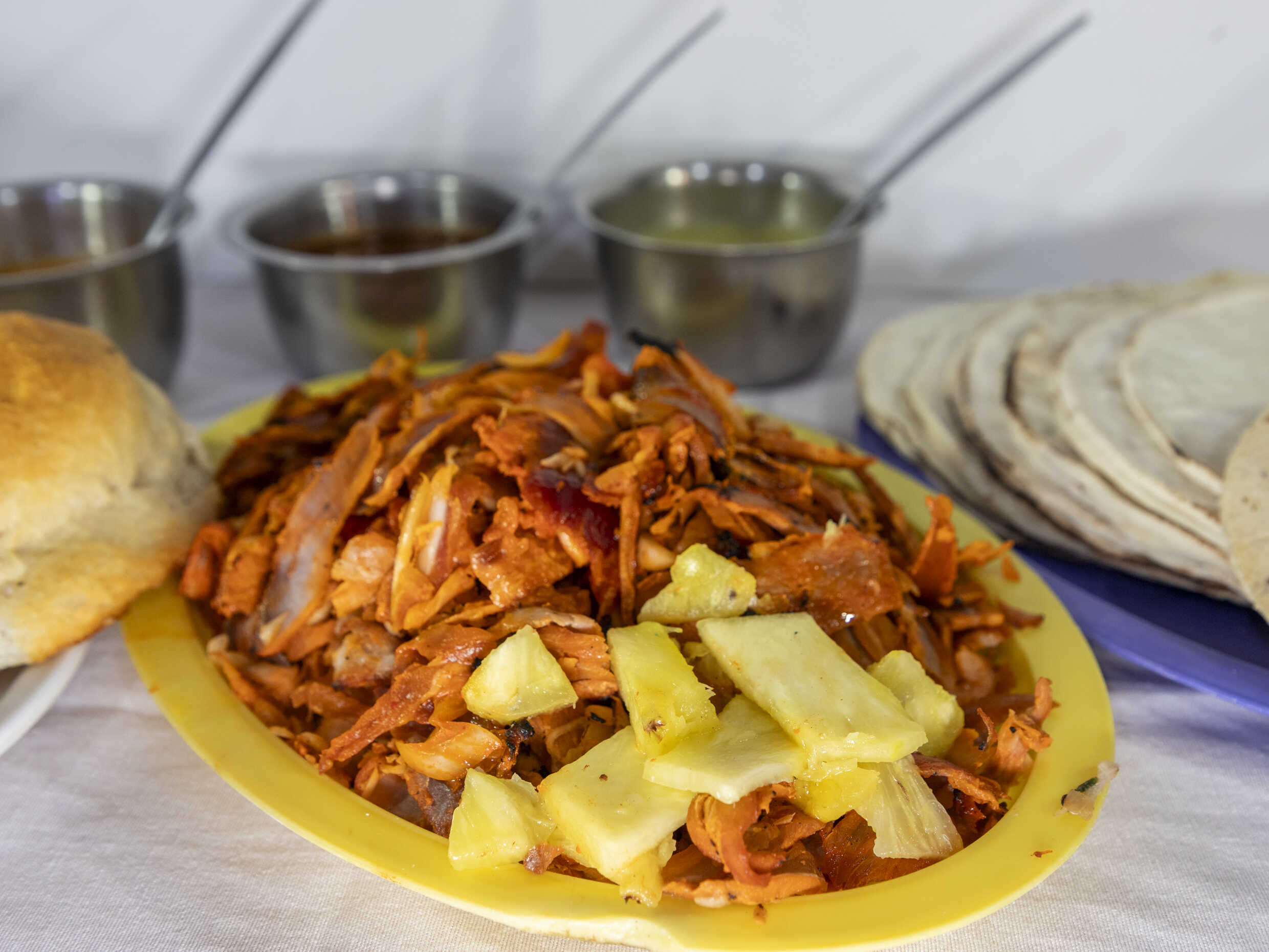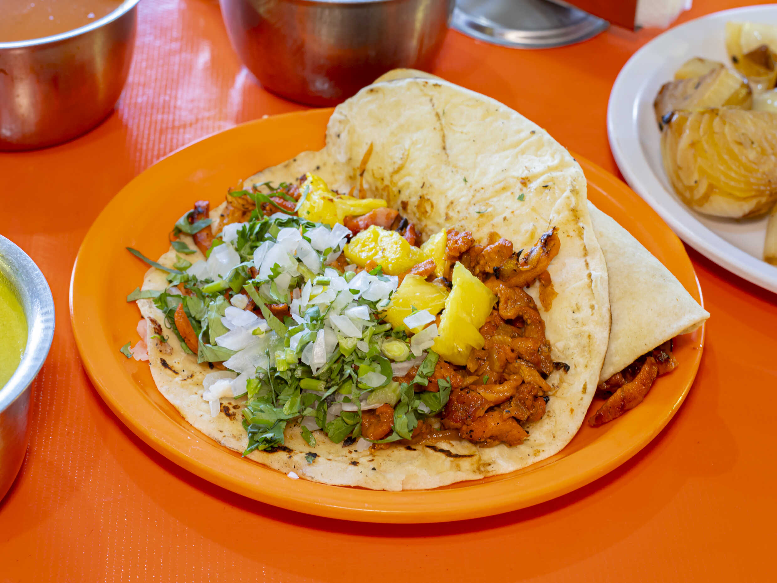 1/4 de carne pastor 2 tortillas de pan árabe 5 tortillas de maíz 1 cemita salsa limones cebollitas