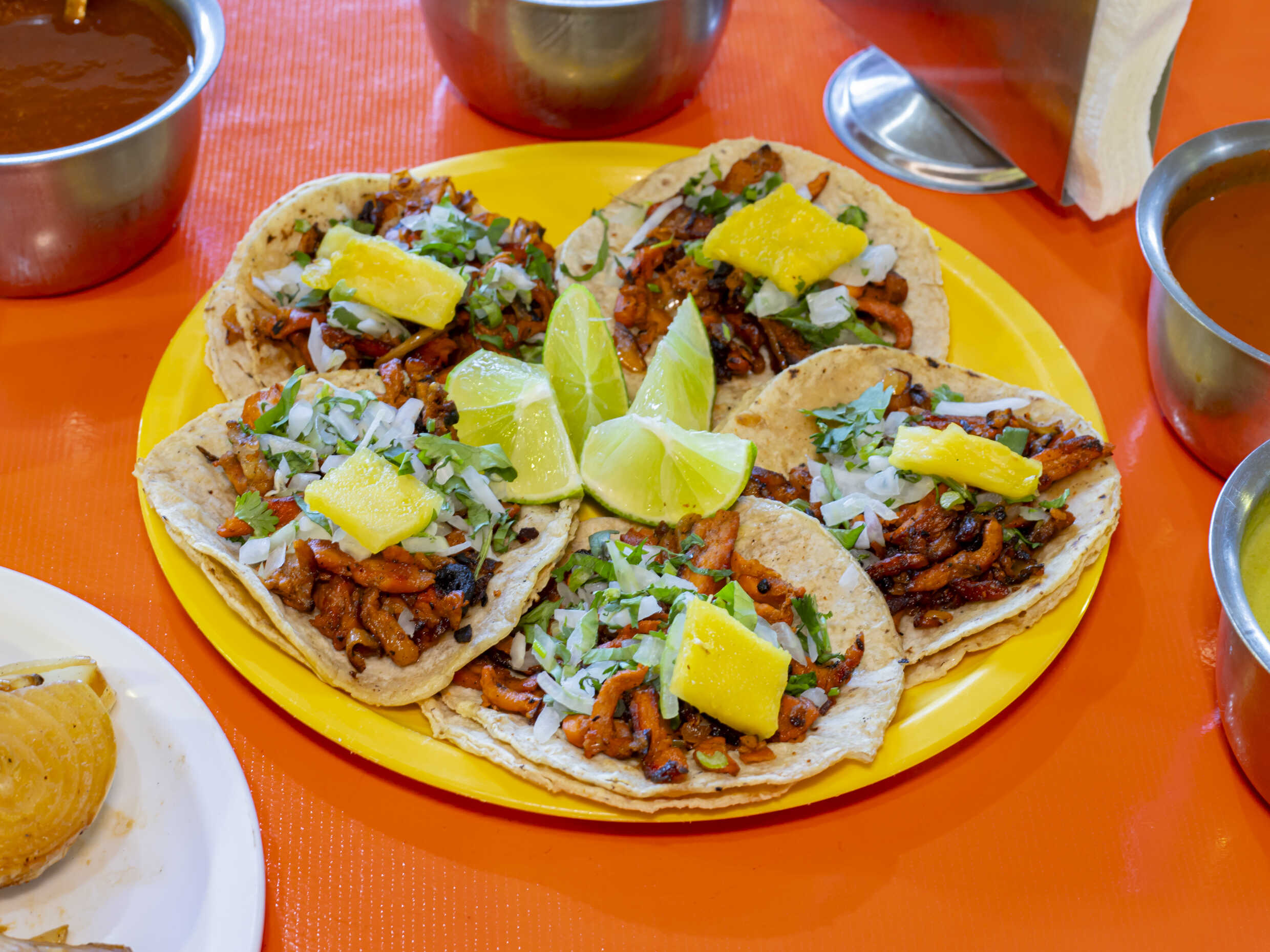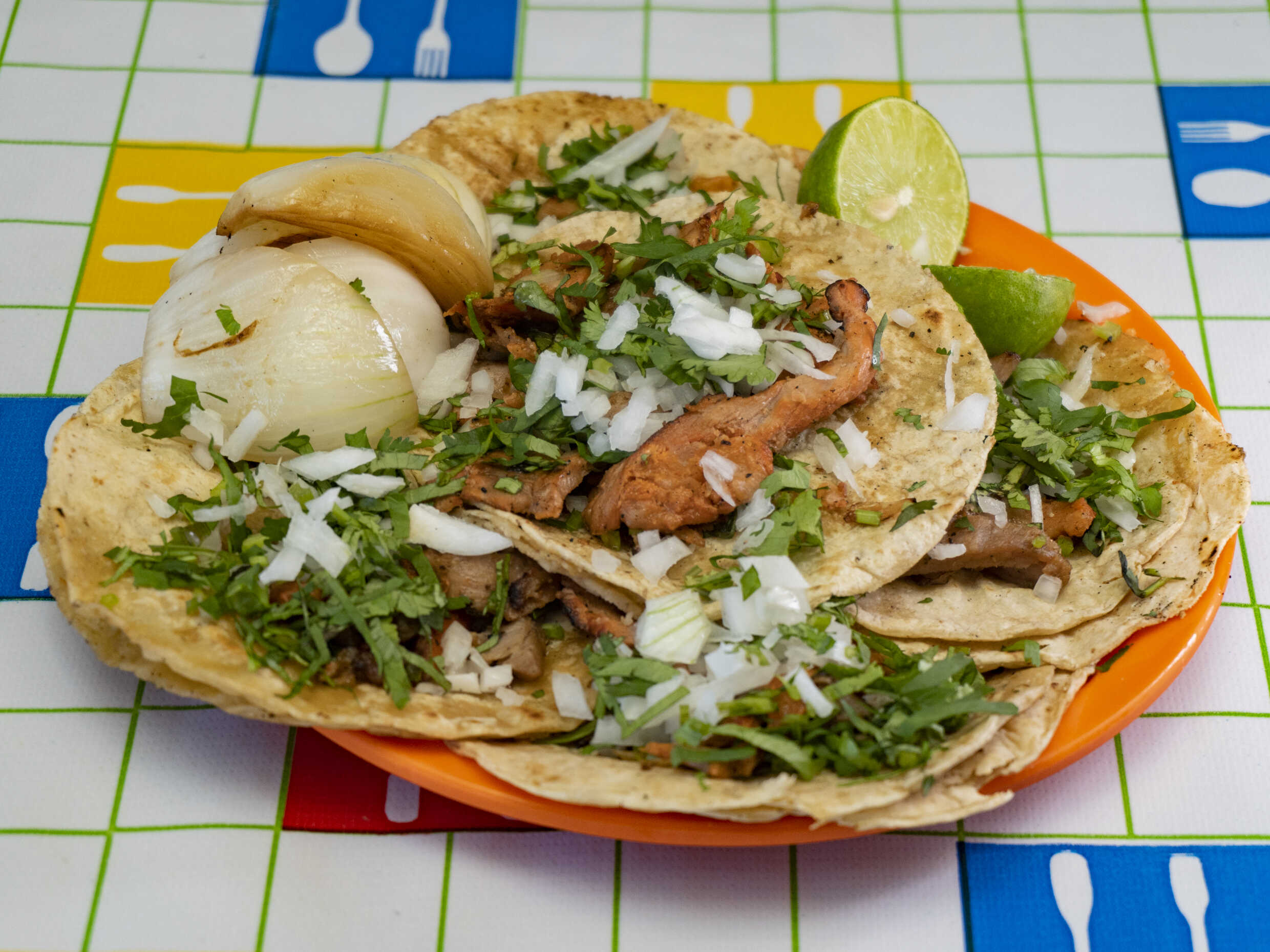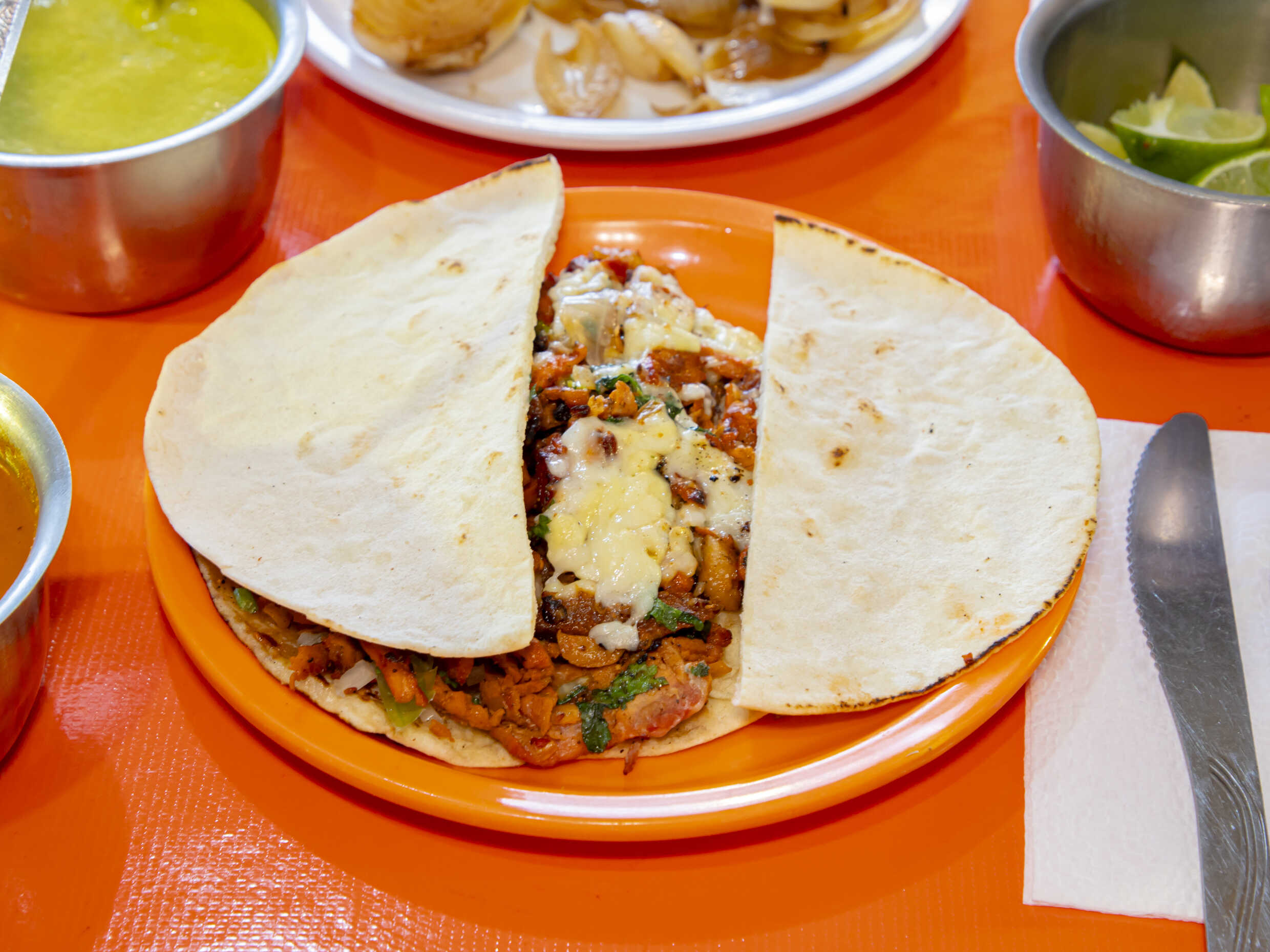 1/4 de carne pastor 2 tortillas de pan árabe 5 tortillas de maíz 1 cemita salsa limones cebollitas