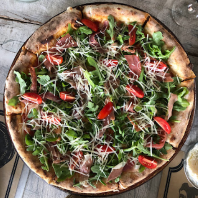 Salsa de tomate, arugula, jitomate cherry, jamon serrano, queso mozarella y queso parmesano rallado