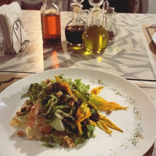 Salsa de limoncello con guarnicion de flor de calabaza, lechuga, arandanos y nuez