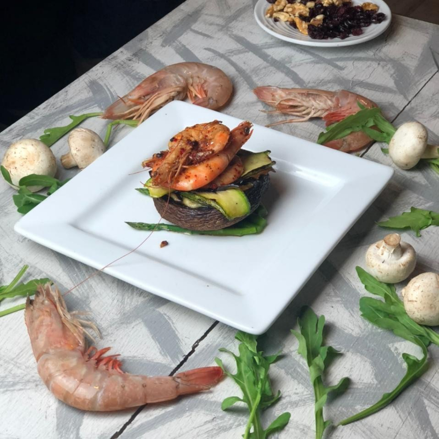 Hongo portobello con queso gorgonzola DOP, calabaza, berenjena y 2 camarones al ajillo