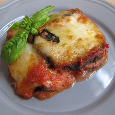 Laminas de berenjena/ laminas de calabaza, salsa de tomate, queso mozzarella, jamon york *con/sin jamon