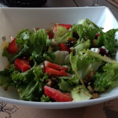Duo de lechugas, nuez, fresas, arandanos, queso gorgonzola con aderezo de miel y mostaza