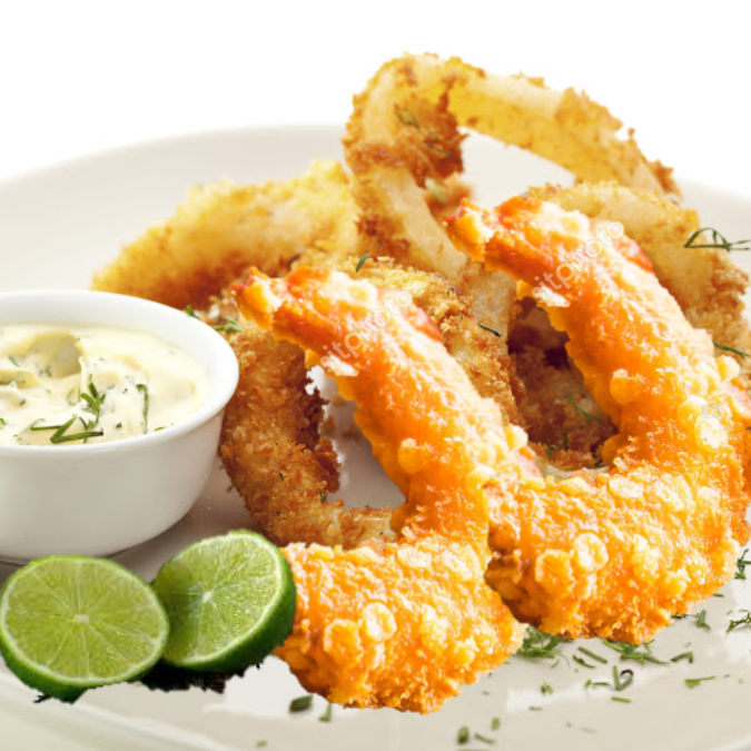 Camarones y calamares capeados en harina y fritos
