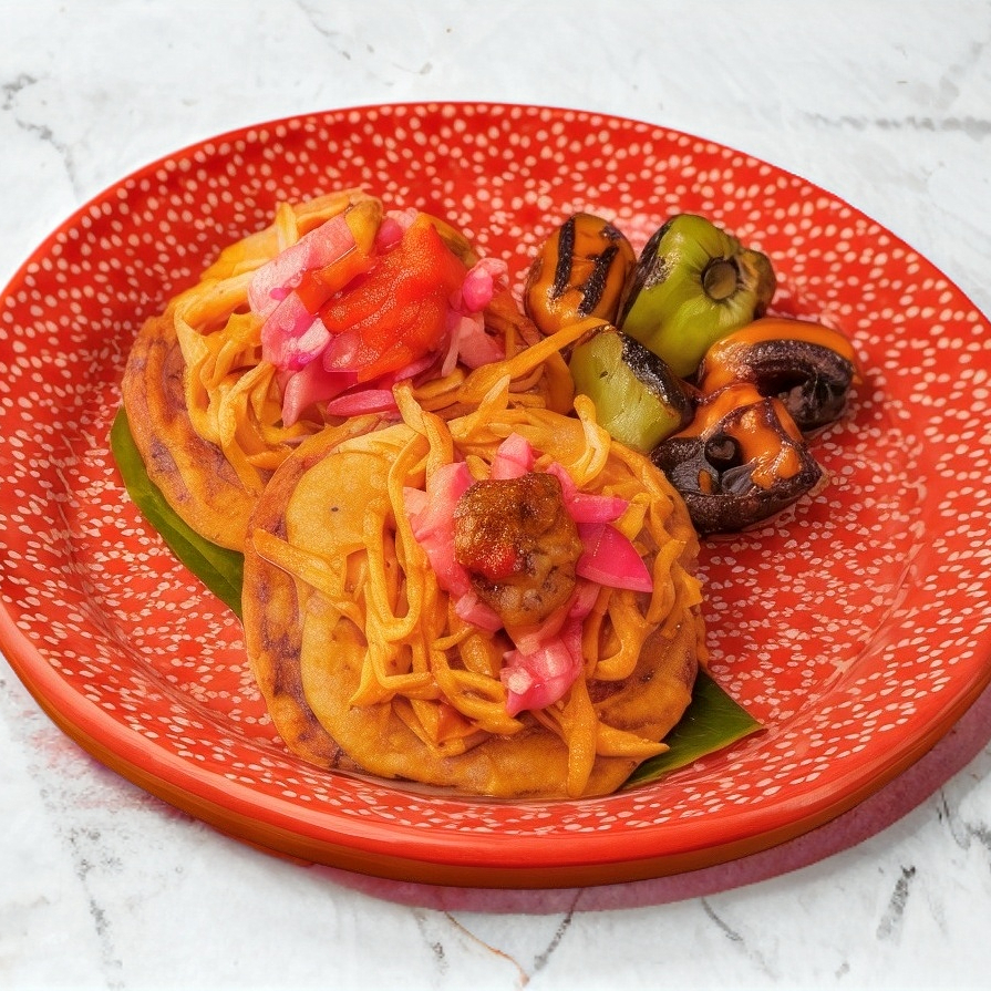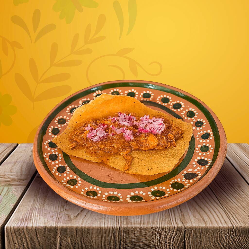 Auténtico sabor yucateco. Masa de maíz frita rellena de frijoles, coronada con nuestra cochinita pibil y un toque de cebolla encurtida.