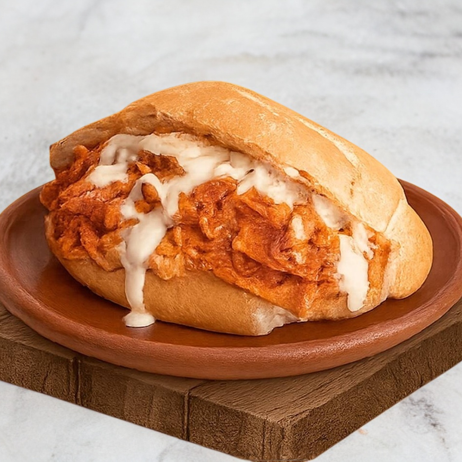 Bolillo fresco relleno de chilaquiles crujientes, cochinita pibil, cebollita y crema. ¡Delicia garantizada!