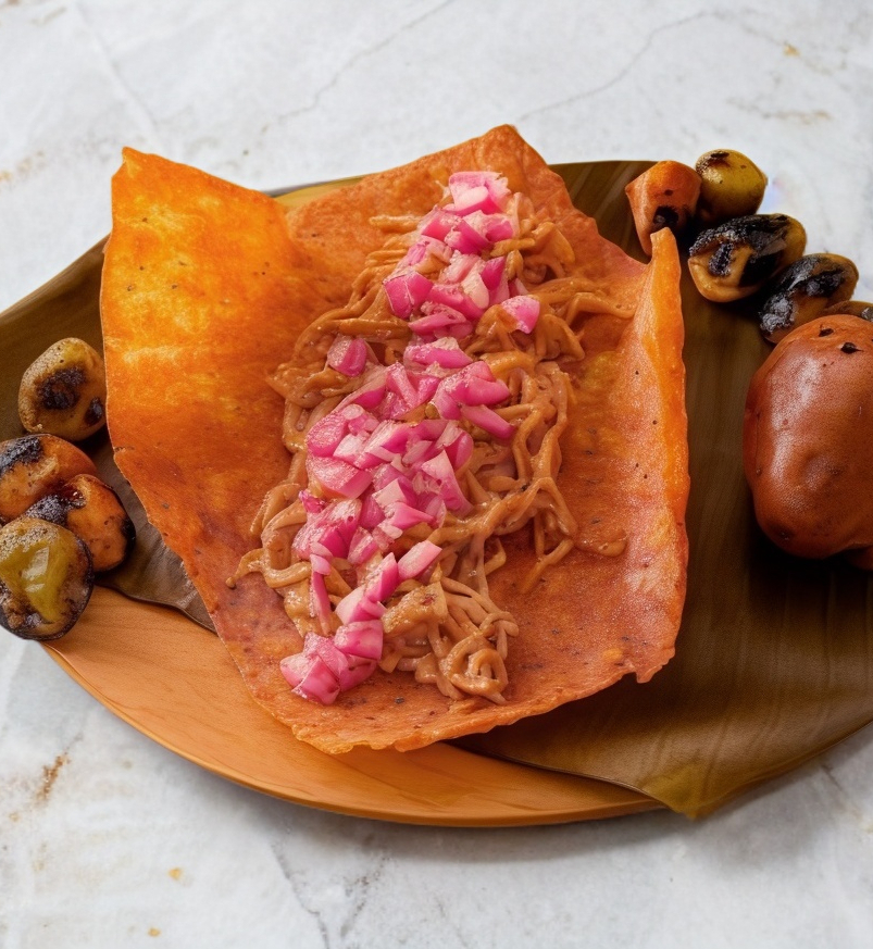 Totopos fritos bañados en salsa pibil coronados con cochinita pibil, cebolla morada y crema.
