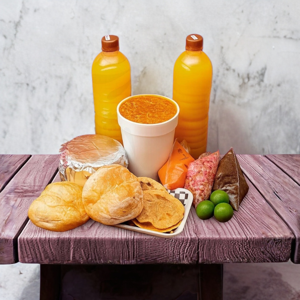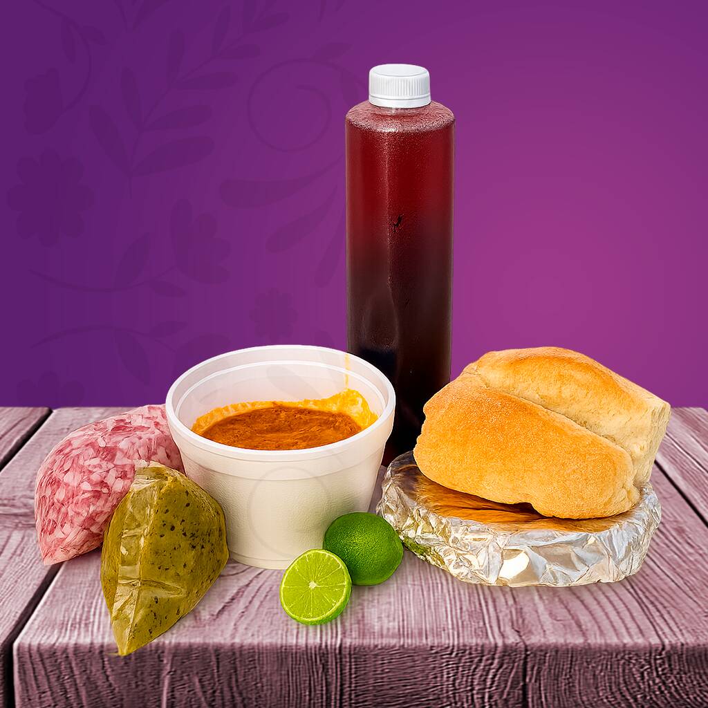 Perfecto para 2 a 3 personas: 1/2 kilo de cochinita pibil, 1/2 kilo de tortillas de maíz, 1 torta o 2 panuchos, salsa tatemada y de la fonda, cebolla morada preparada, limones, 1 L de agua de sabor.