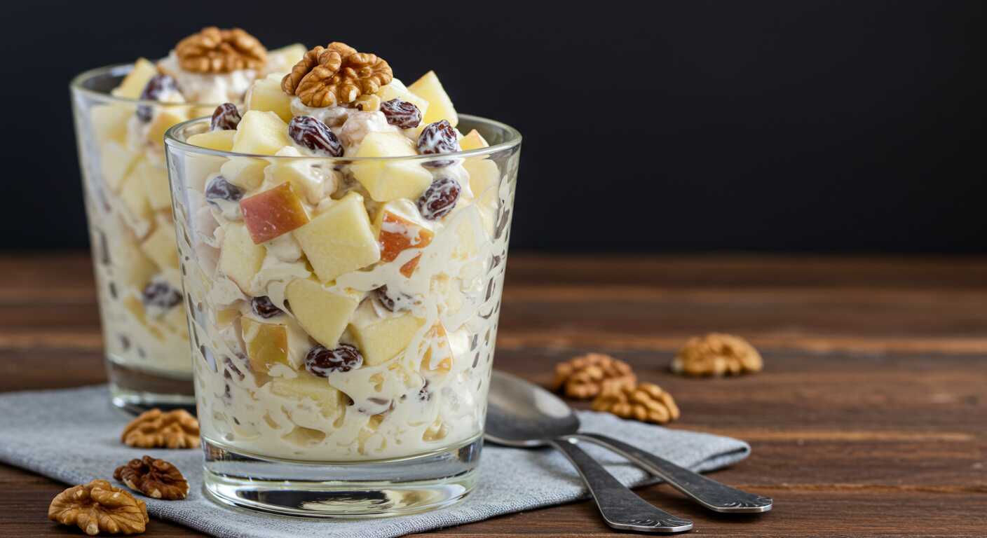 Tradicional ensalada navideña preparada con manzanas frescas, crema, nuez y un toque dulce de pasas. Cremosa, refrescante y perfecta para acompañar cualquier ocasión especial.