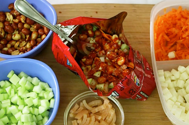 Maruchan a elegir, esquites, limonsal, mayonesa, cacahuate a elegirqueso amarillo, queso añejo y salsa a elegir.