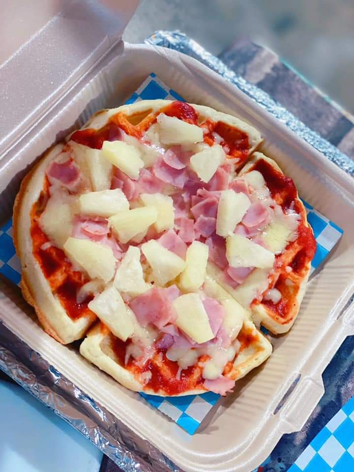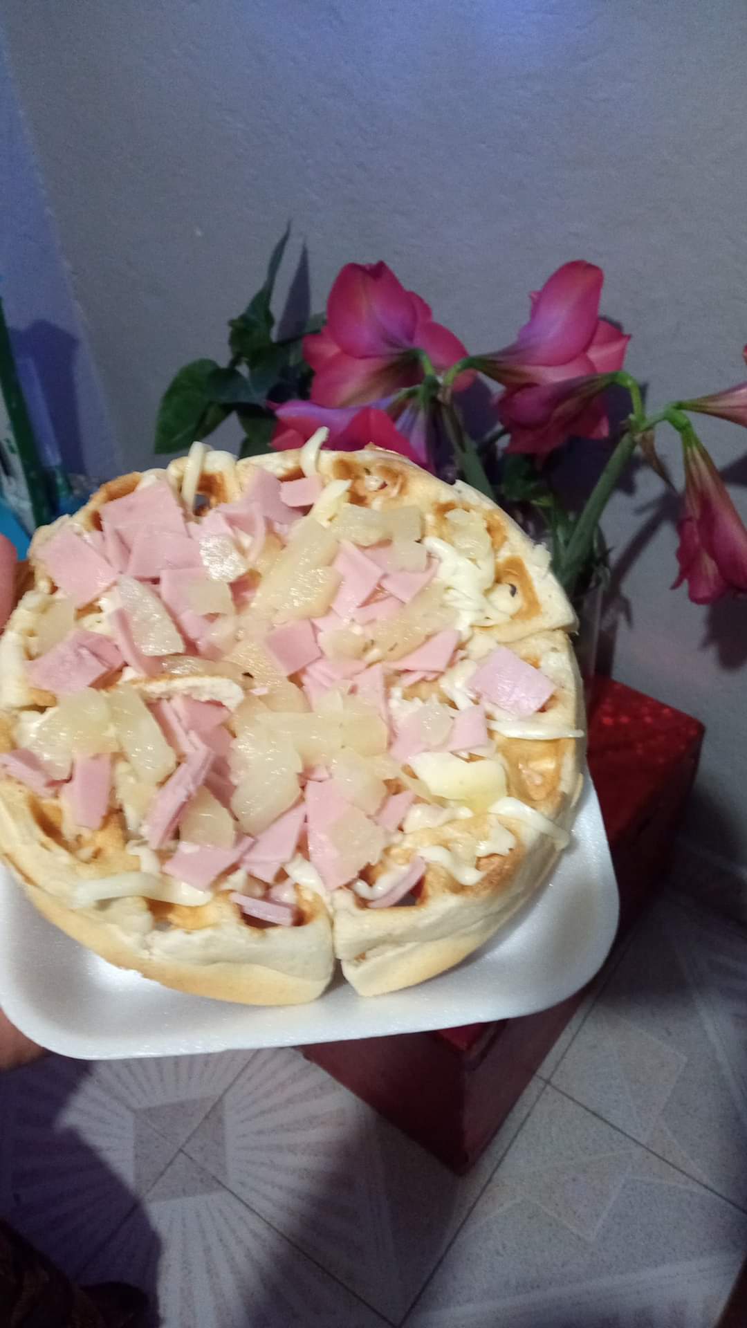 Caja de pizza, 2 waffles tipo belga, frase, moño y 2 lechitas santa clara