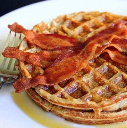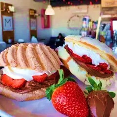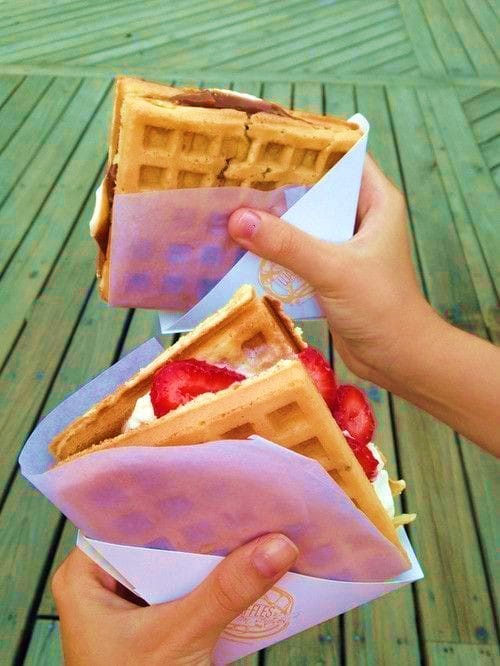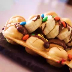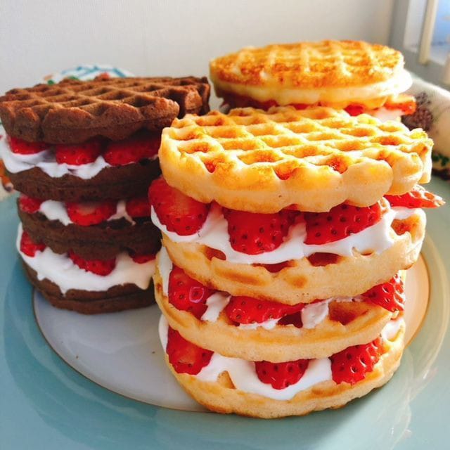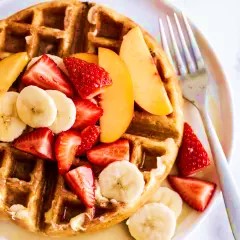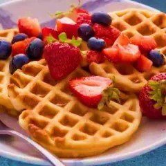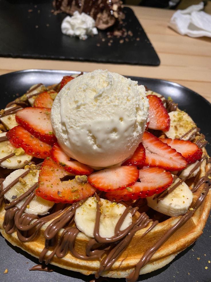 4 mini Waffles y sobre otro acompañados de tu dulce, fruta y toping favorito.