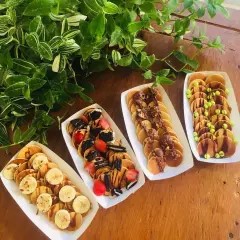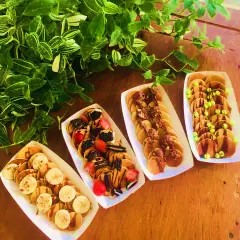 3 Piezas, 1 dulce, 1 topping, 1 fruta.