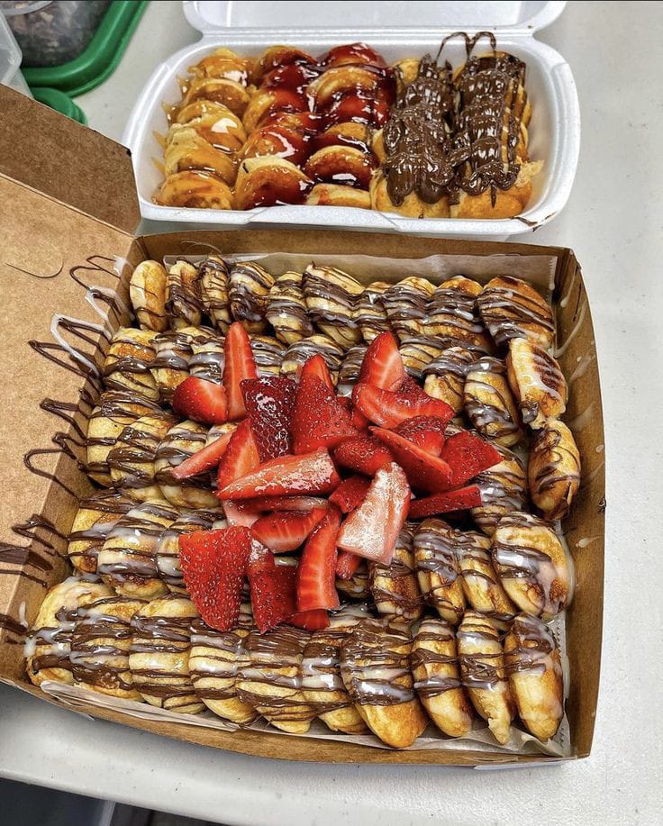 25 mini pancakes, fruta, dulce, topping, frase, moño y lechita santa clara