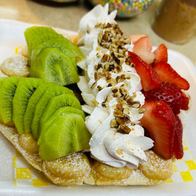 Waffle con kiwi, fresa, ferrero, coco rayado, crema batida
