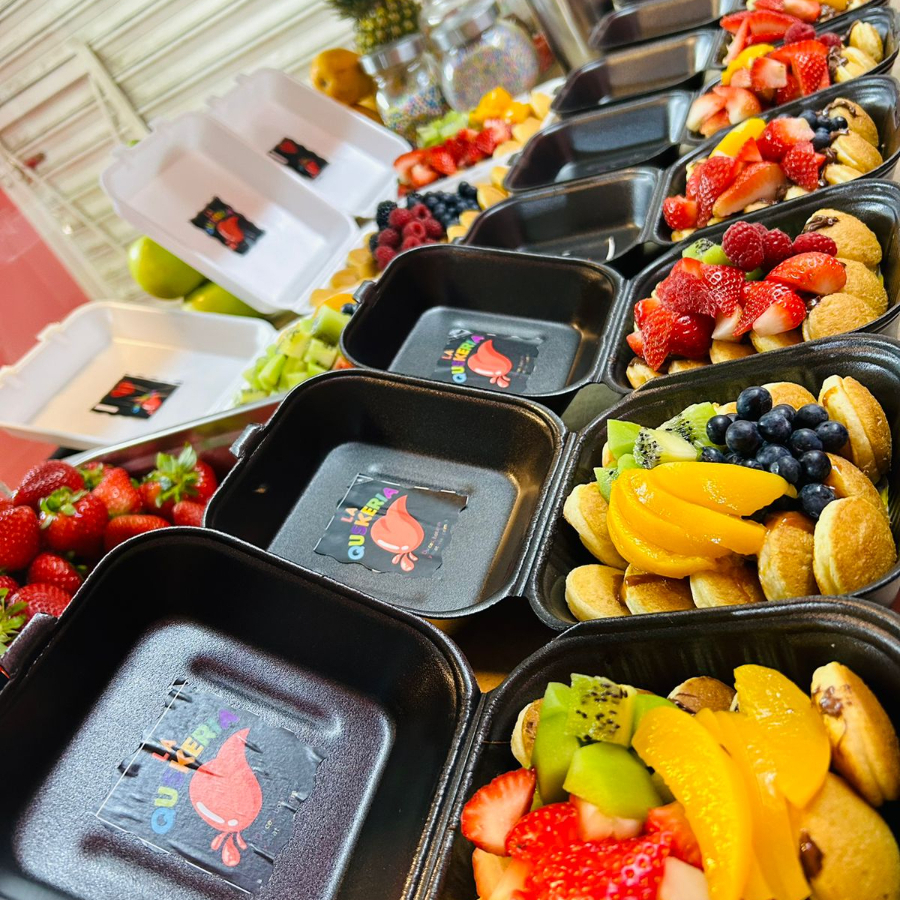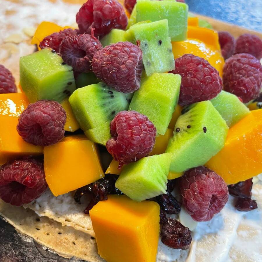Waffle con kiwi, durazno, frambuesa, berries, lechera, philadelphia