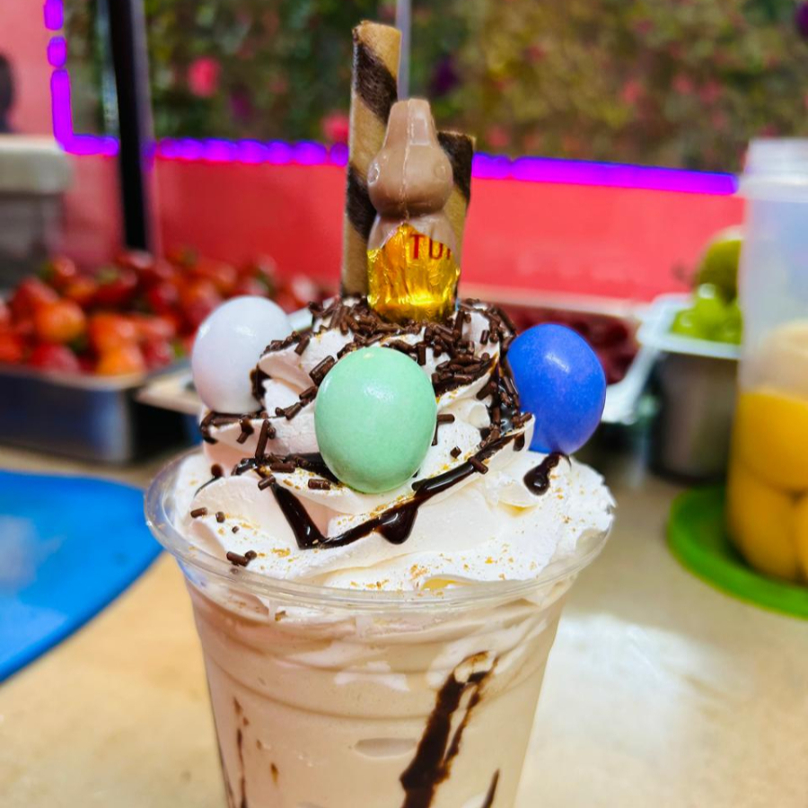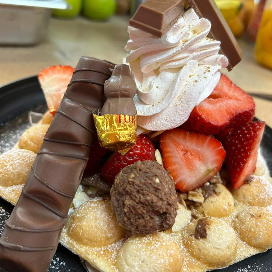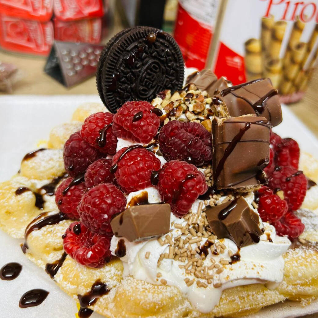 Waffle con fresa, frambuesa, helado chocolate, ferrero, conejo turin, kitkat, trozos kinder bueno