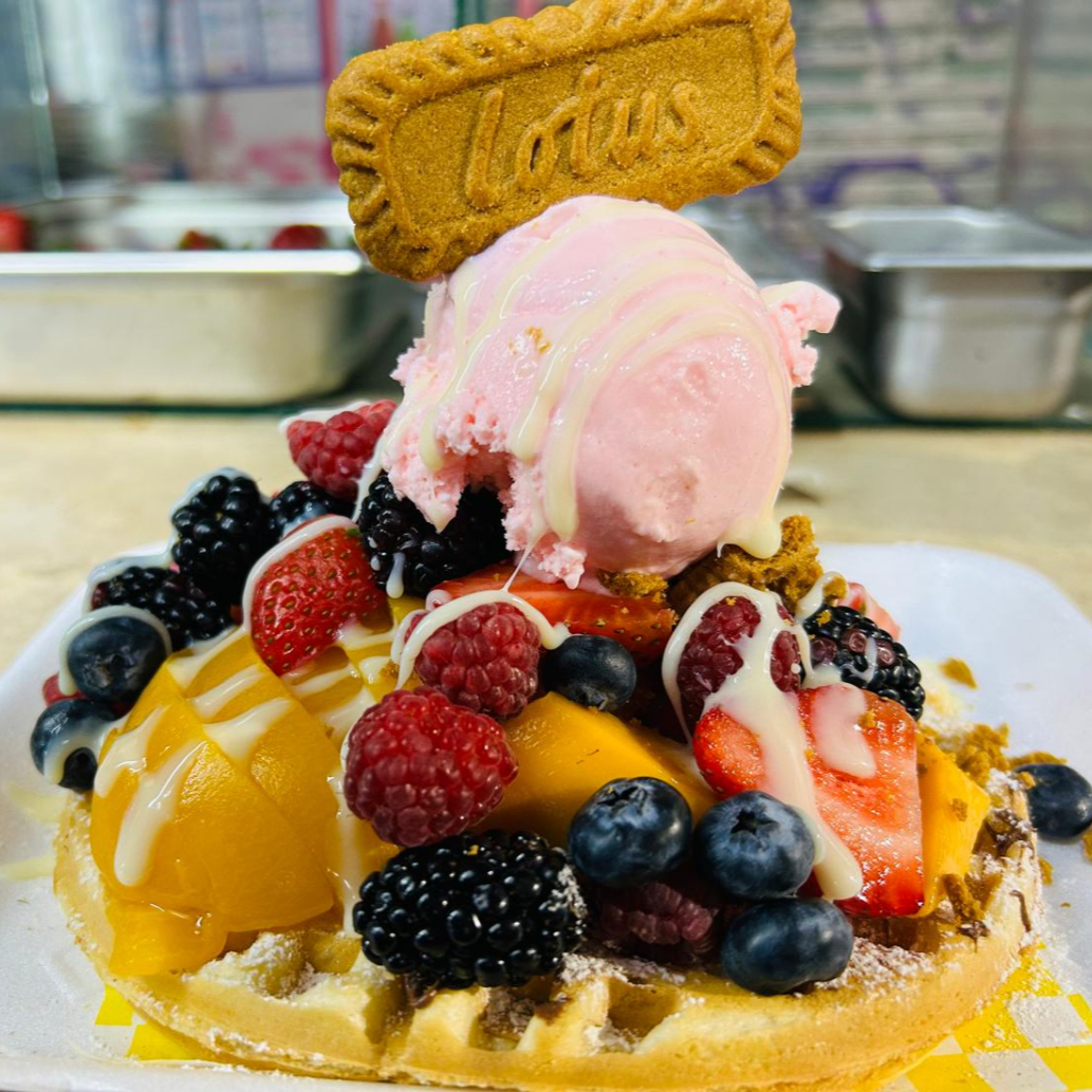 Waffle con mango, fresa, frambuesa, zarzamora, berry, helado de fresa, galleta lotus