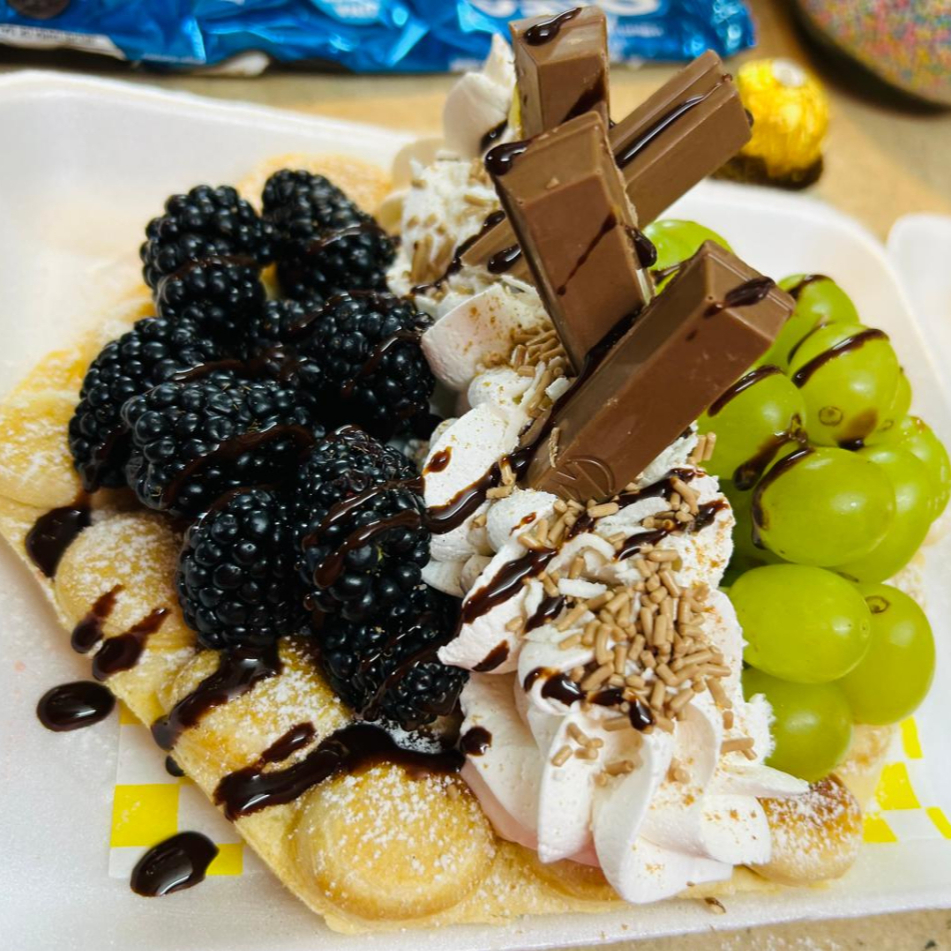 Waffle con zarzamora, uva, kitkat, crema batida