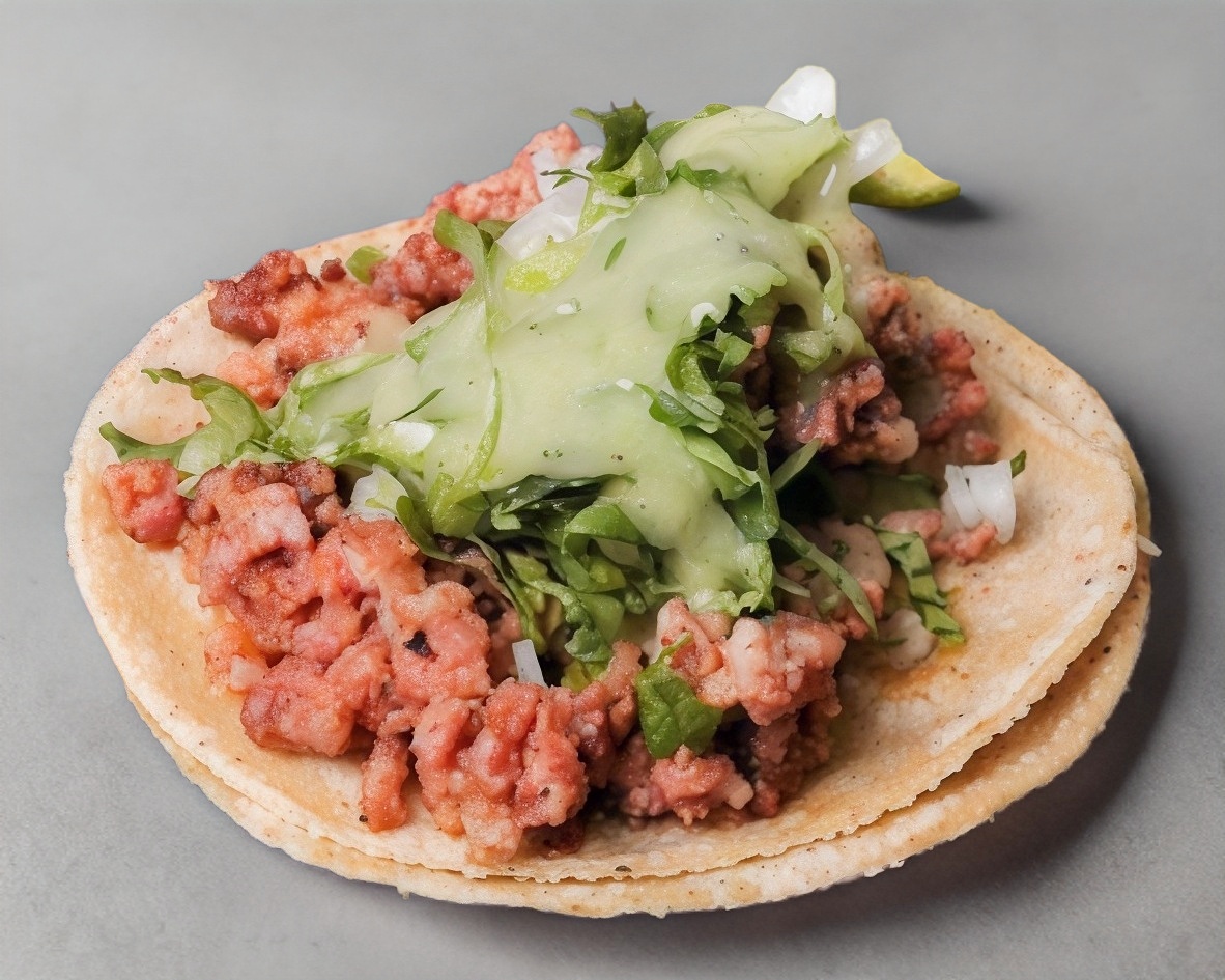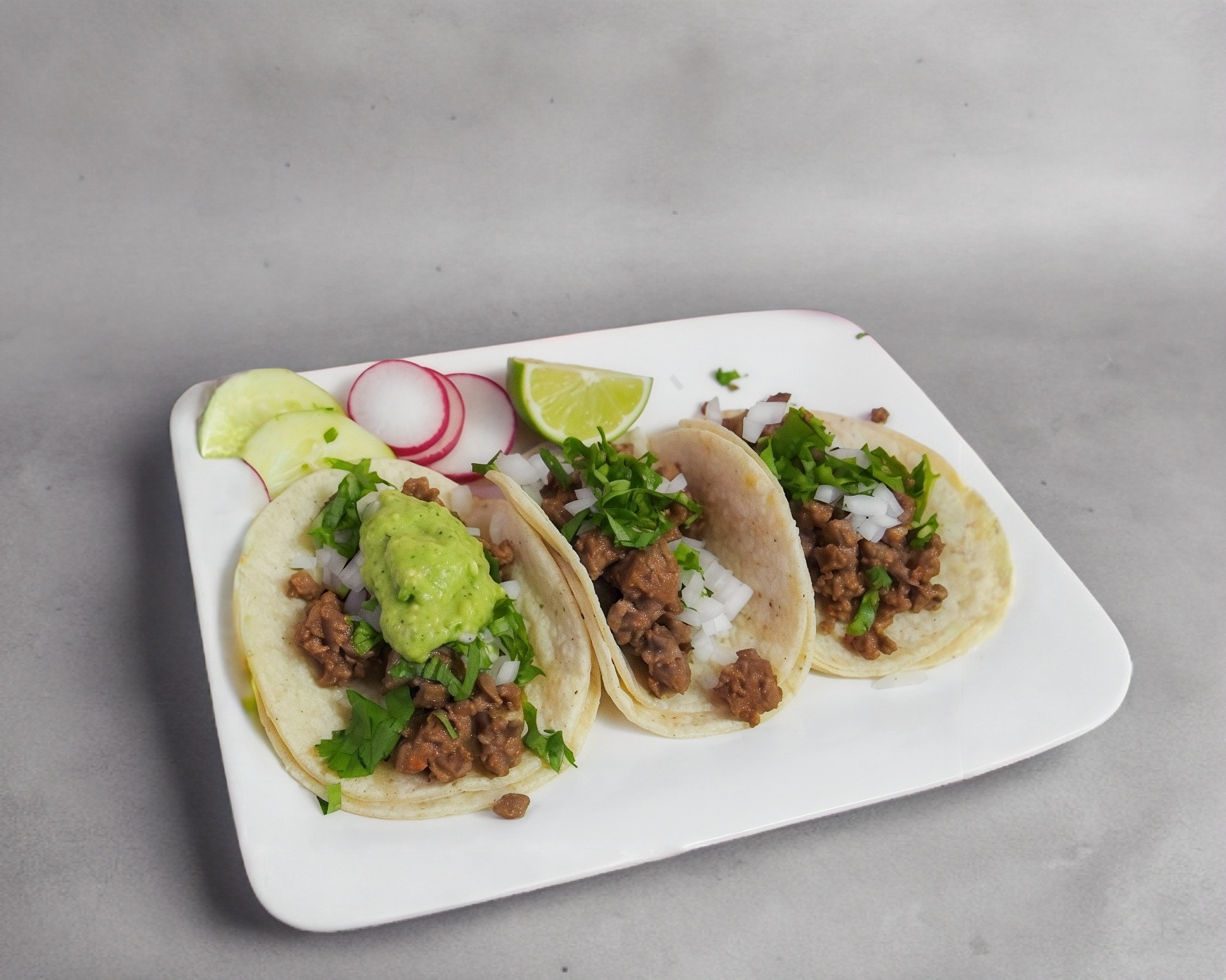 Carne asada de cerdo, cilantro, cebolla y guacamole, 2 tortillas de maíz, salsa rojaaparte.