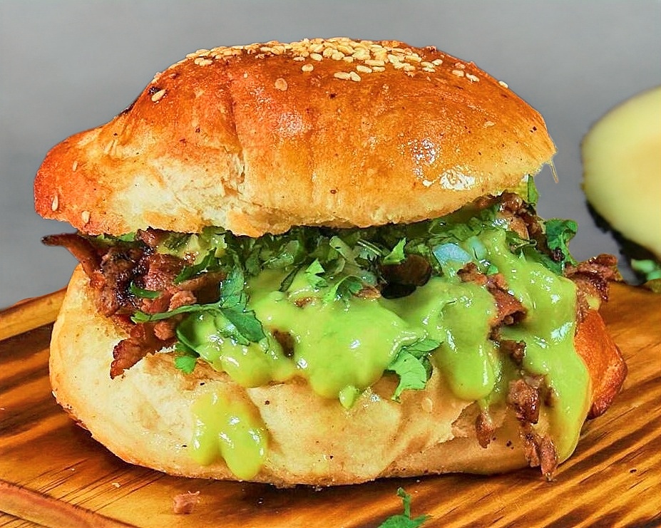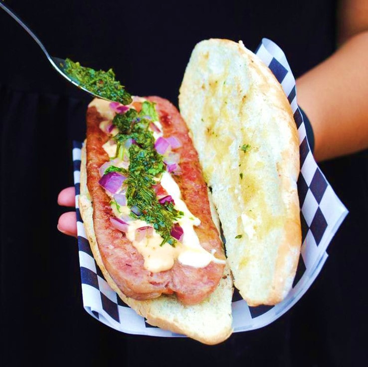 Pan Brioche con Chorizo Argentino, jitomate, chimichurri, guacamole y salsa aparte.