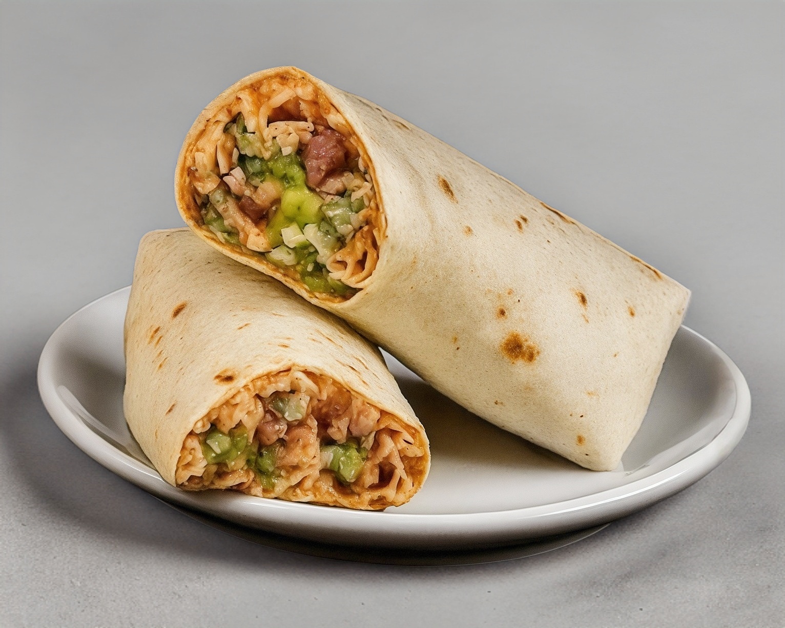 Tortilla de Harina Grande, Carne de Asada, arroz, frijol, verdura, guacamole, limón y salsa aparte.