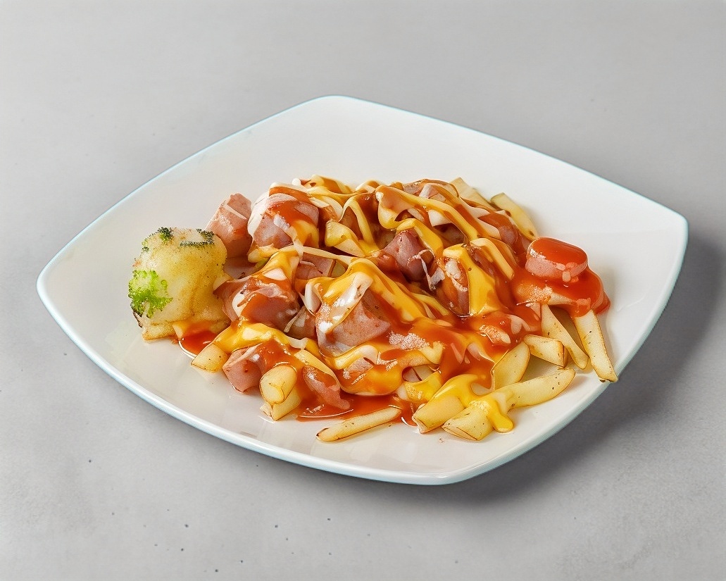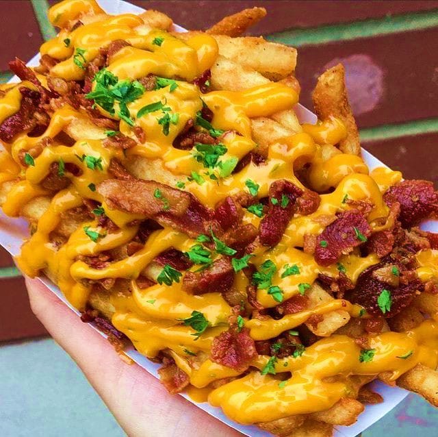 Porción individual de papa natural frita, chesse whiz, trocitos de tocino frito.