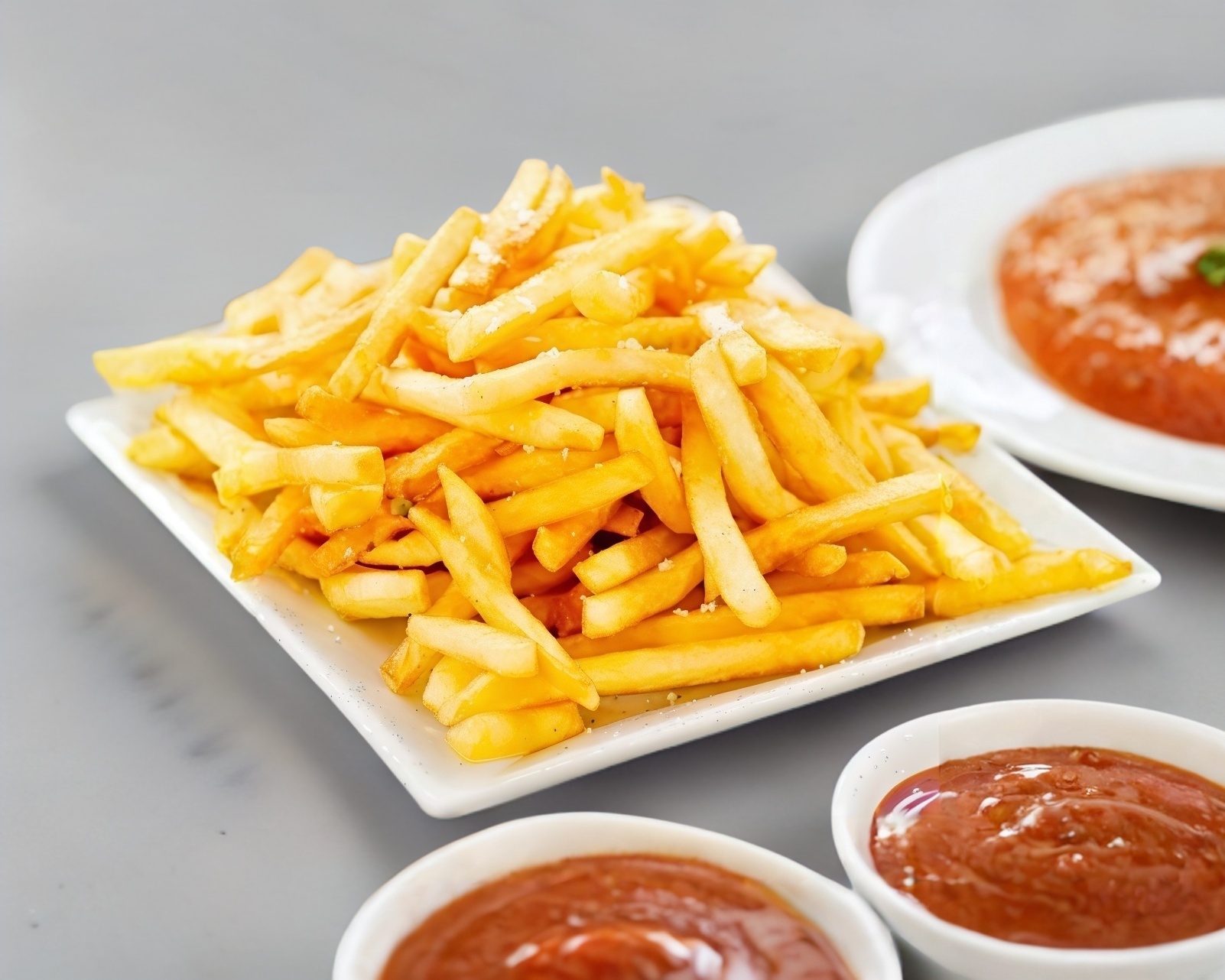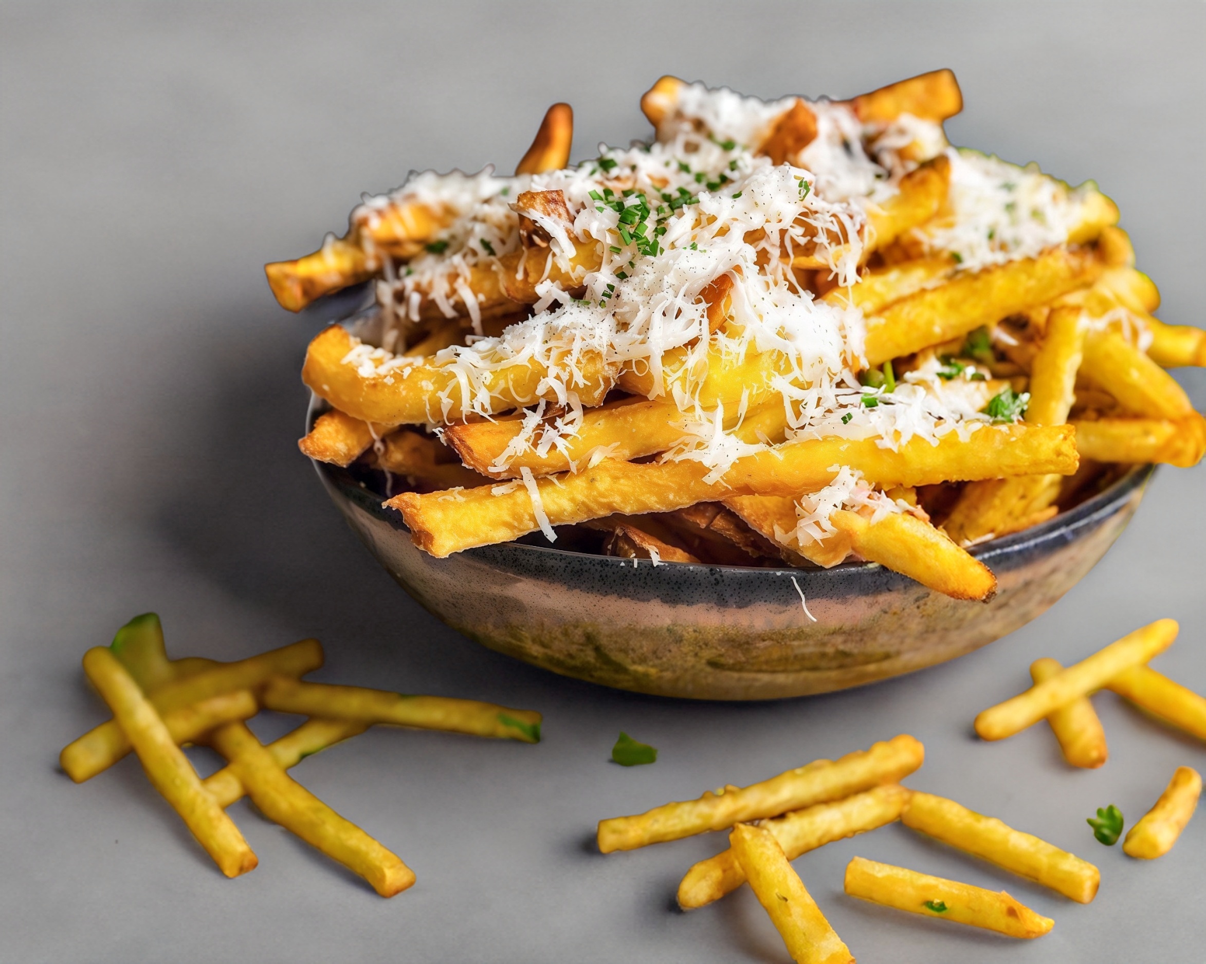 papa natural frita a la francesa, aderezada con aceite de trufa y espolvoreada de quesa parmesano.
