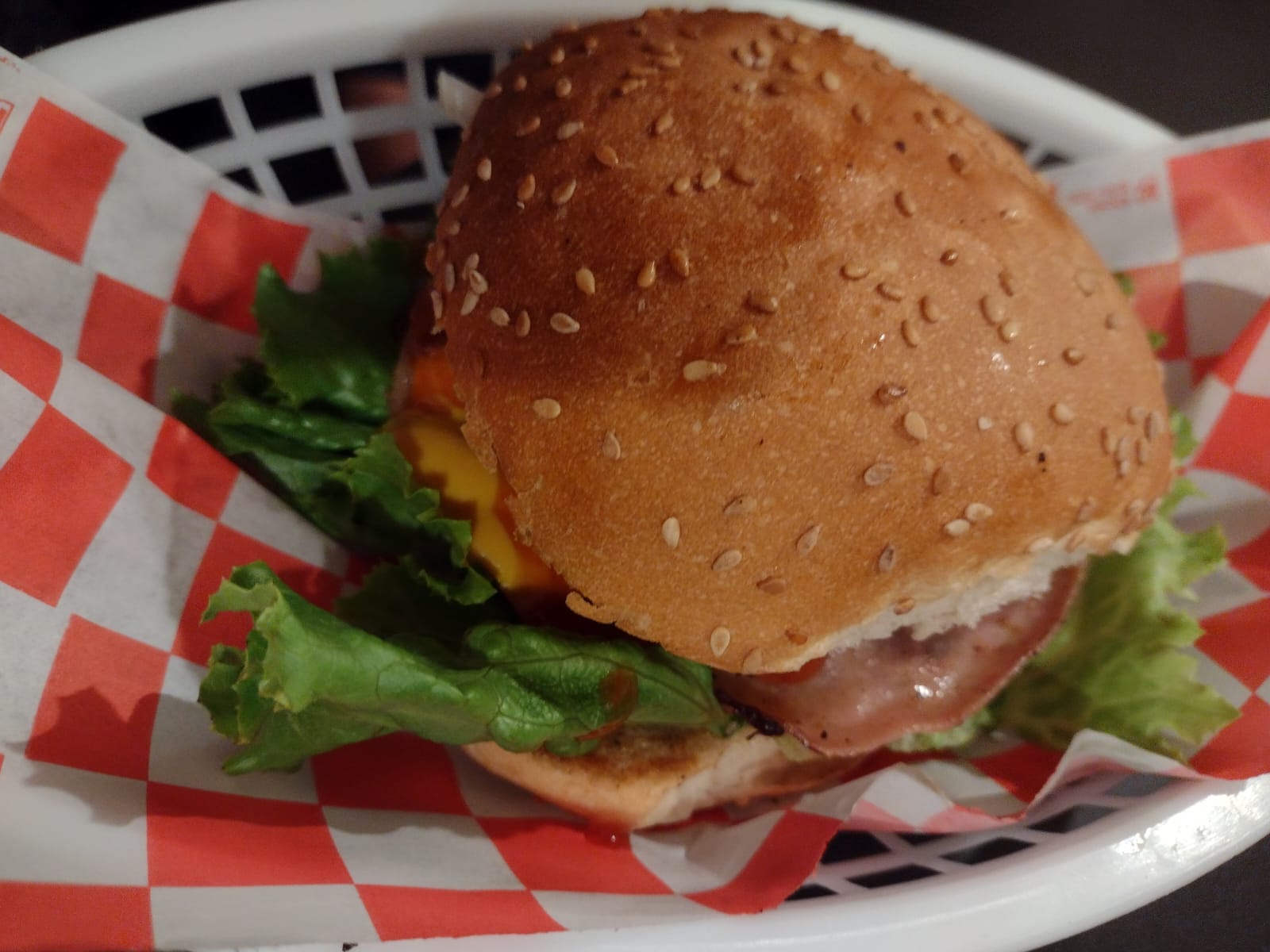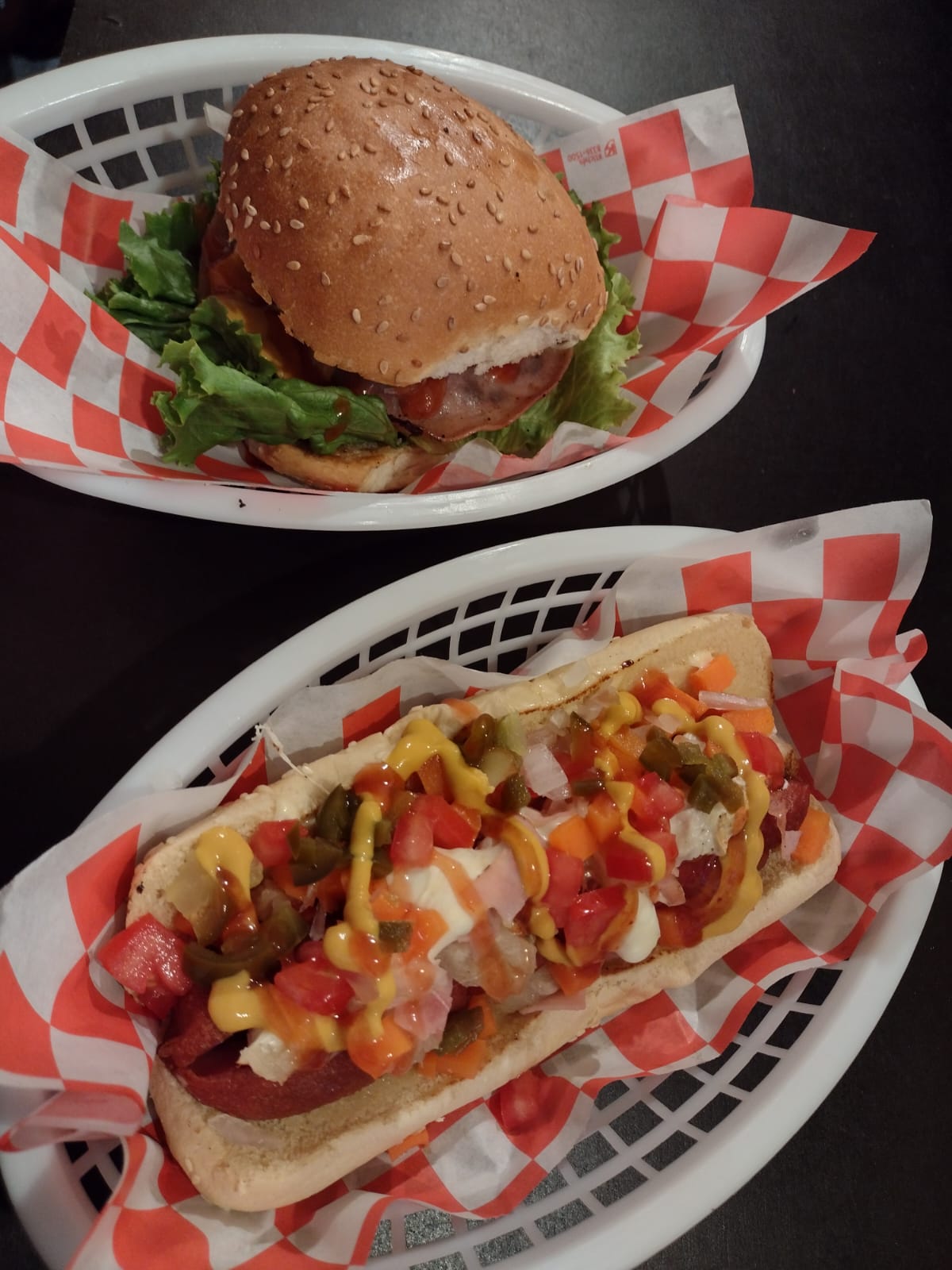Carne de res, queso amarillo, lechuga, jitomate, cebolla, mayonesa, catsup, mostaza.