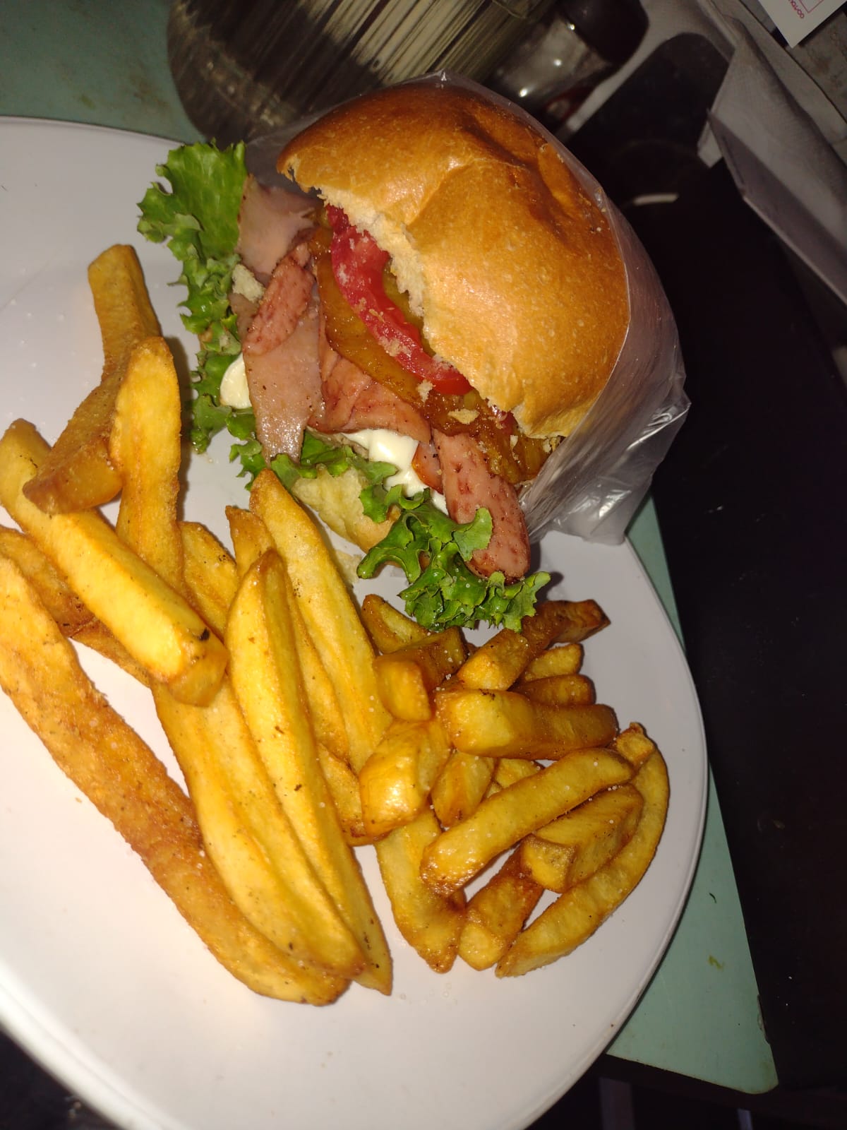 Tocino, Cebolla, Jitomate, Mayonesa, Catsup, Mostaza.