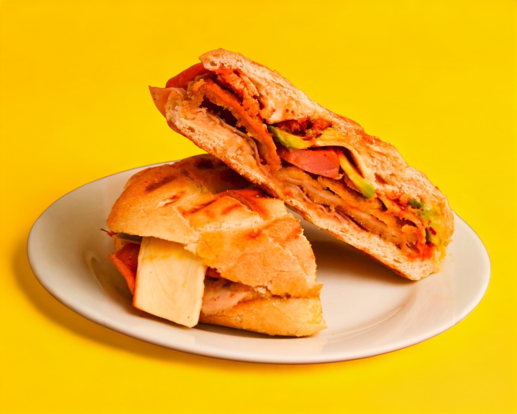 3 panes doraditos, Jamón de pavo, queso manchego, lechuga, aguacate, jitomate, cebolla, mayonesa, incluye papas fritas