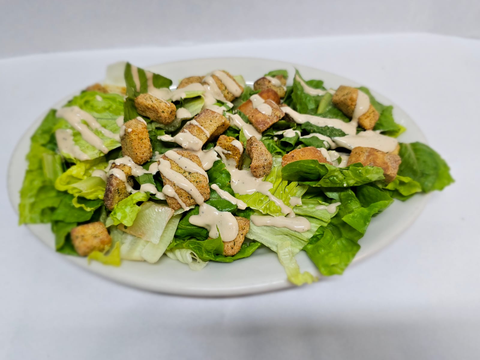 Lechuga, croutones, queso parmesano y aderezo césar.