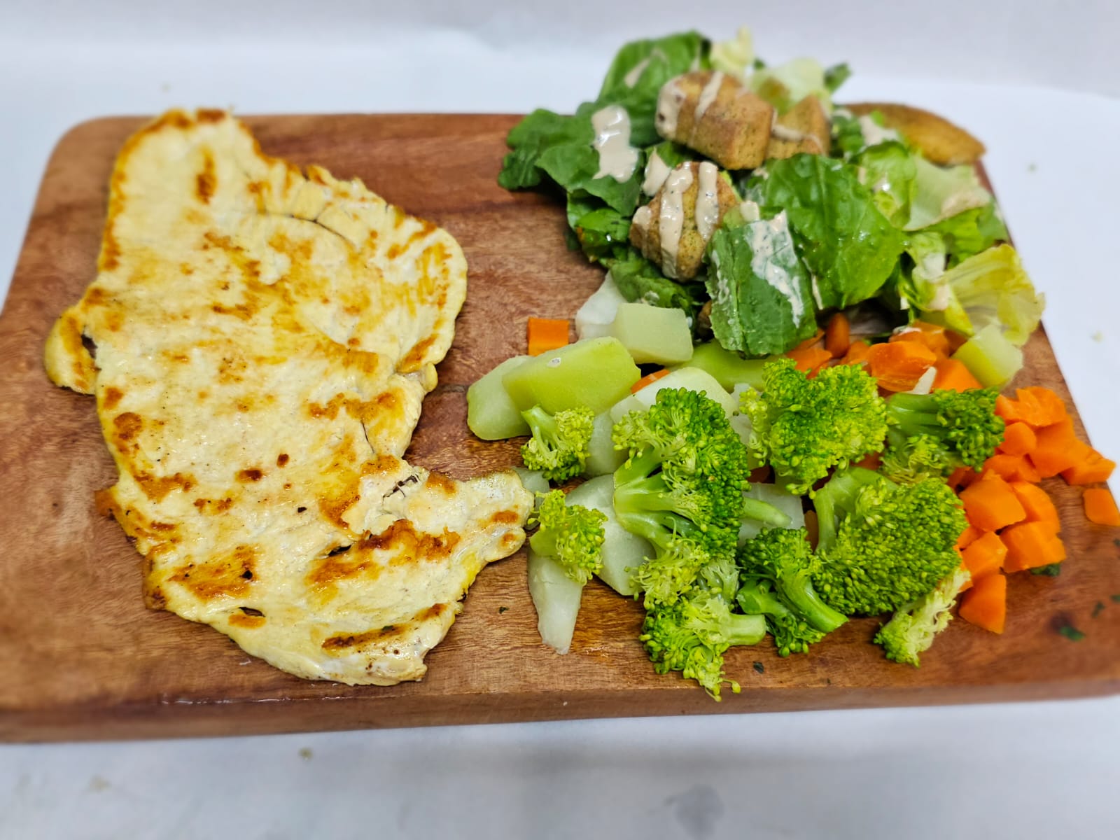 Pechuga de pollo empanizada, bañada con salsa pomodoro y gratinada, incluye 2 guarniciones.