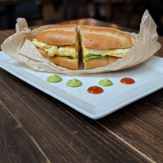 Huevo estrellado cafe del dia +torta queso crema aguacate cebolla morada