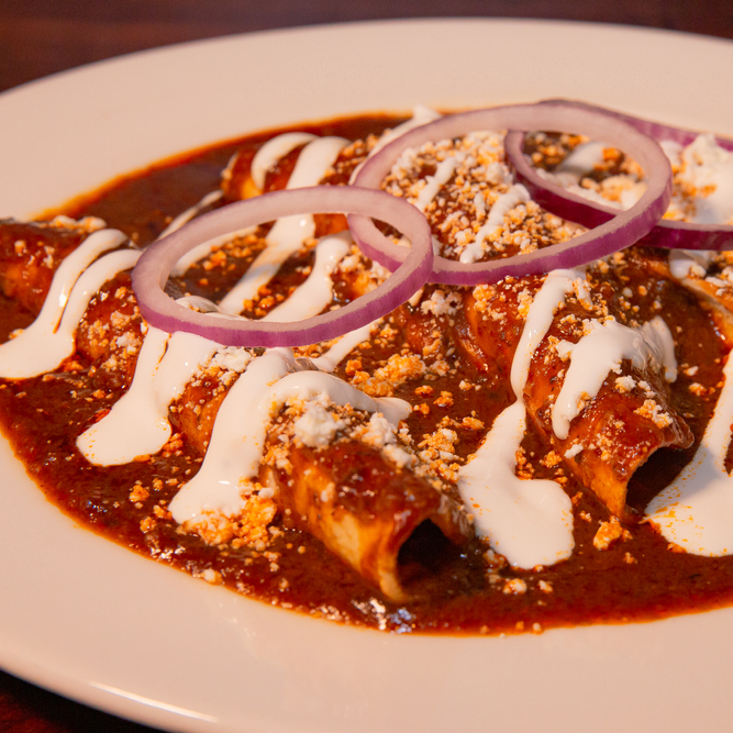 Enchiladas rojas con pollo queso crema aguacate cebolla