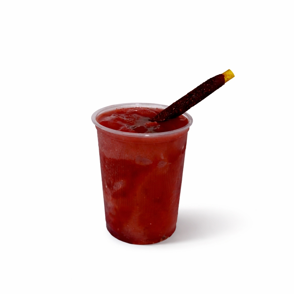 Deliciosa mezcla de pulpa de fresa, hielo,chamoy y tajin acompañado de una banderilla de tamarindo PERFECTO PARA REFRESCARTE