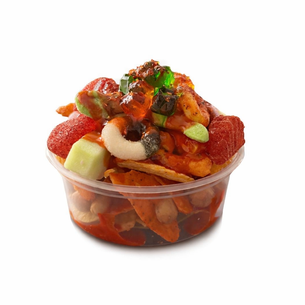 Bolsa de fritura con pepino en trozos, cacahuates, salsas y gomitas