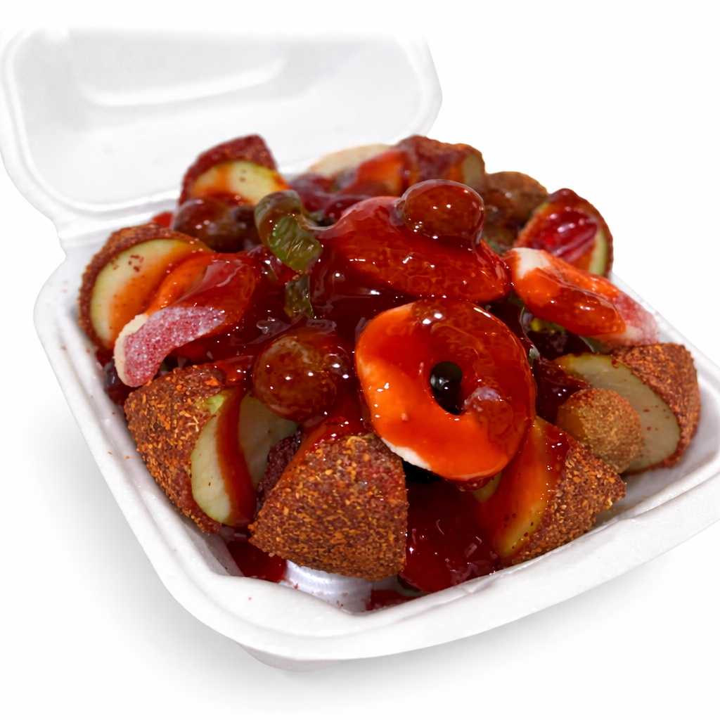 Deliciosa manzana cubierta de chamoy acompañada de cacahuate, gomitas y salsas