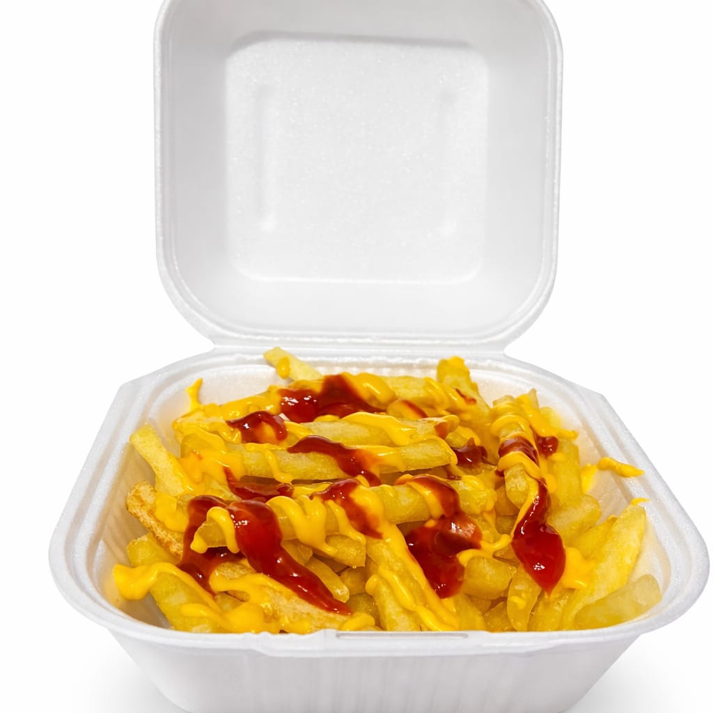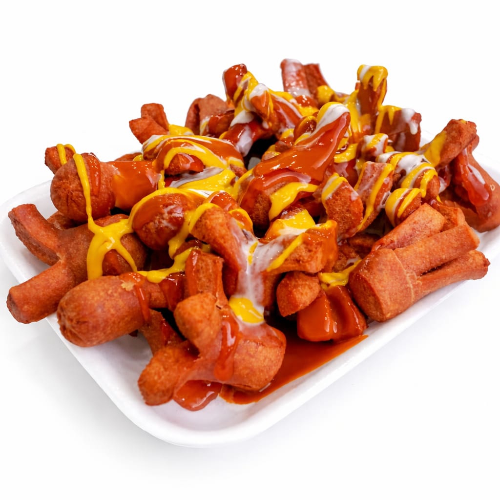 deliciosos Trocitos de salchicha con papas a la francesa, salsas, queso amarillo y mayonesa