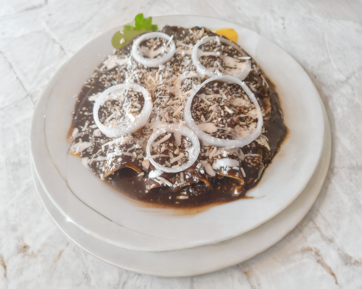 4'tortiilas envu ltas y rellenas de pollo deshebrado adornados con cebolla ,crema ,queso y ajonjoli
