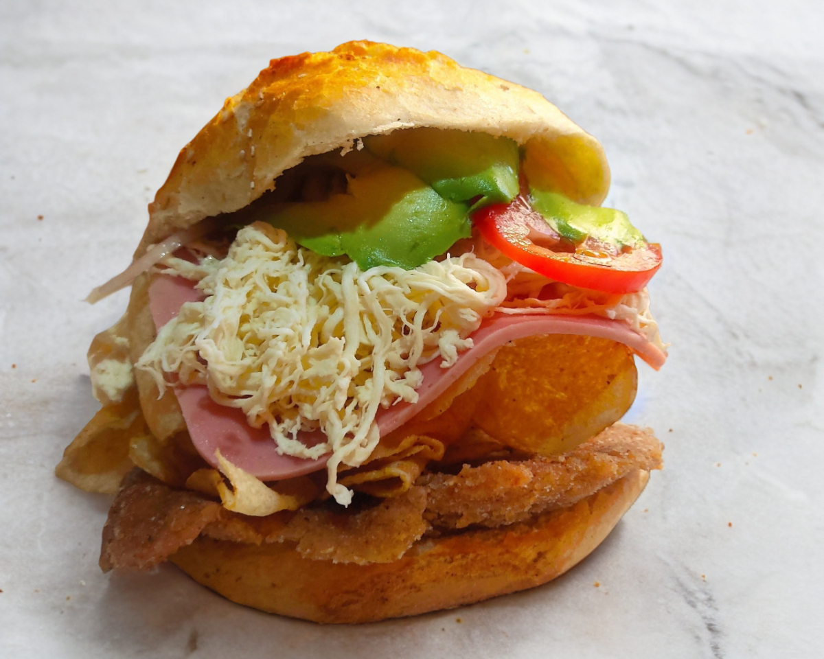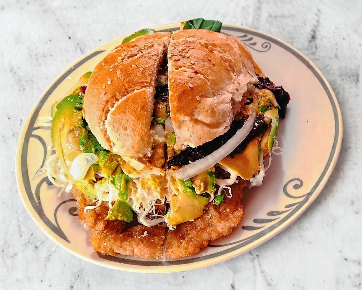 Pan de torta ,milanesa de puerco ,frijoles, mayonesa ,quesillo aguacate ,picante a elegir ,,cebolla y agucate