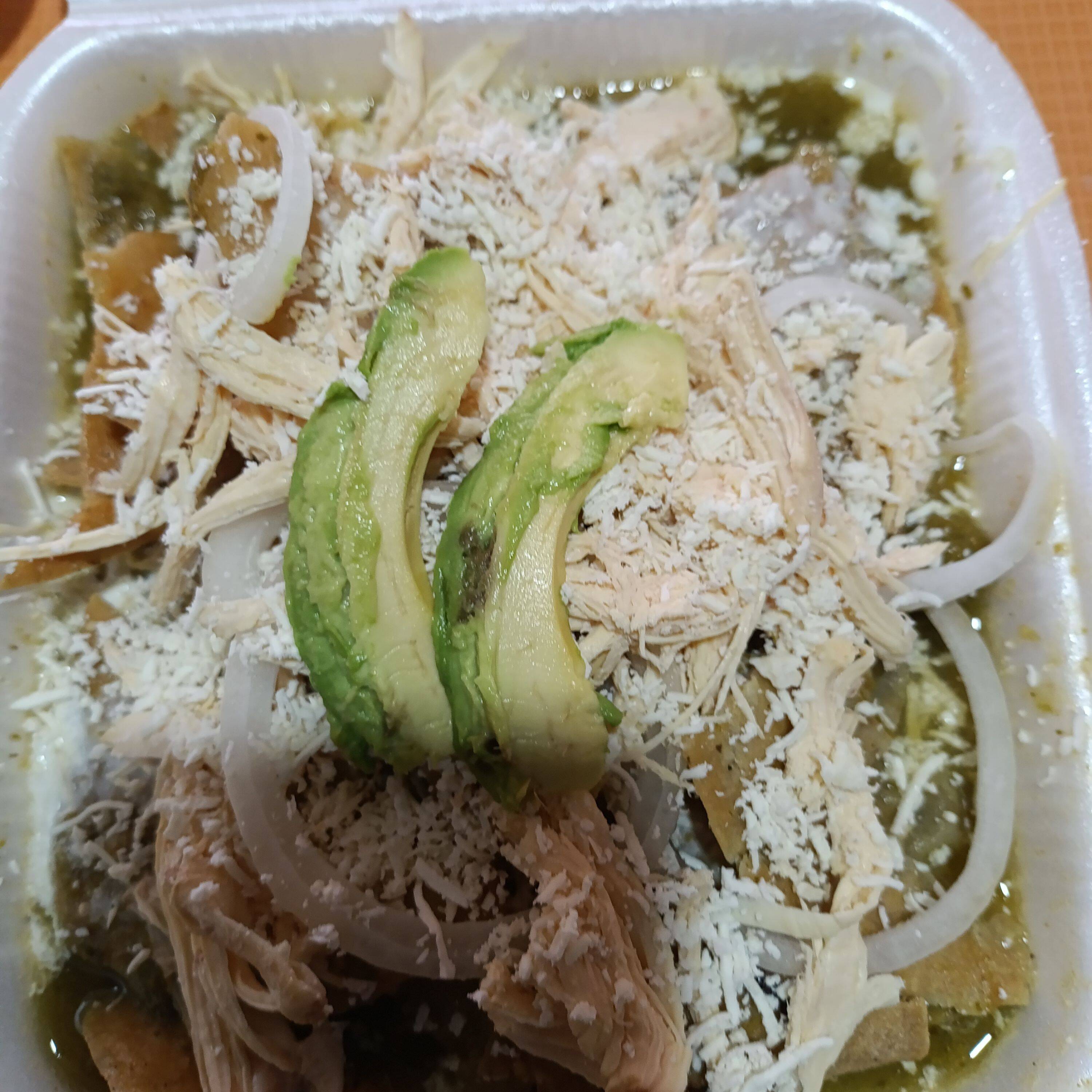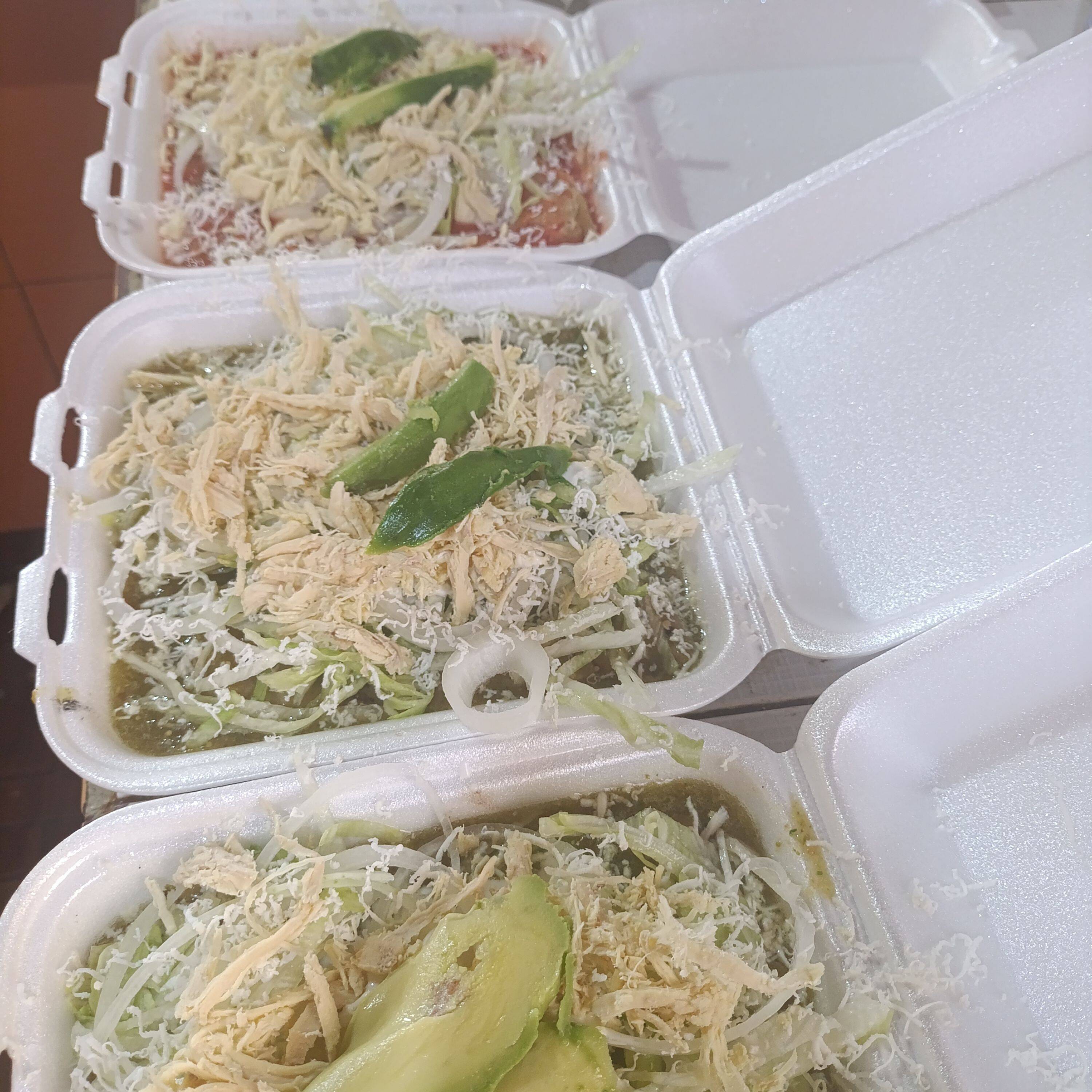 90 grs de totopos bañados en salsa de su elección,acompañads por proteína a elegiry adornados con crema ,queso ,cebolla ,y su torta de agua