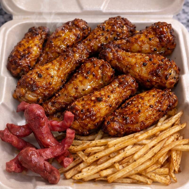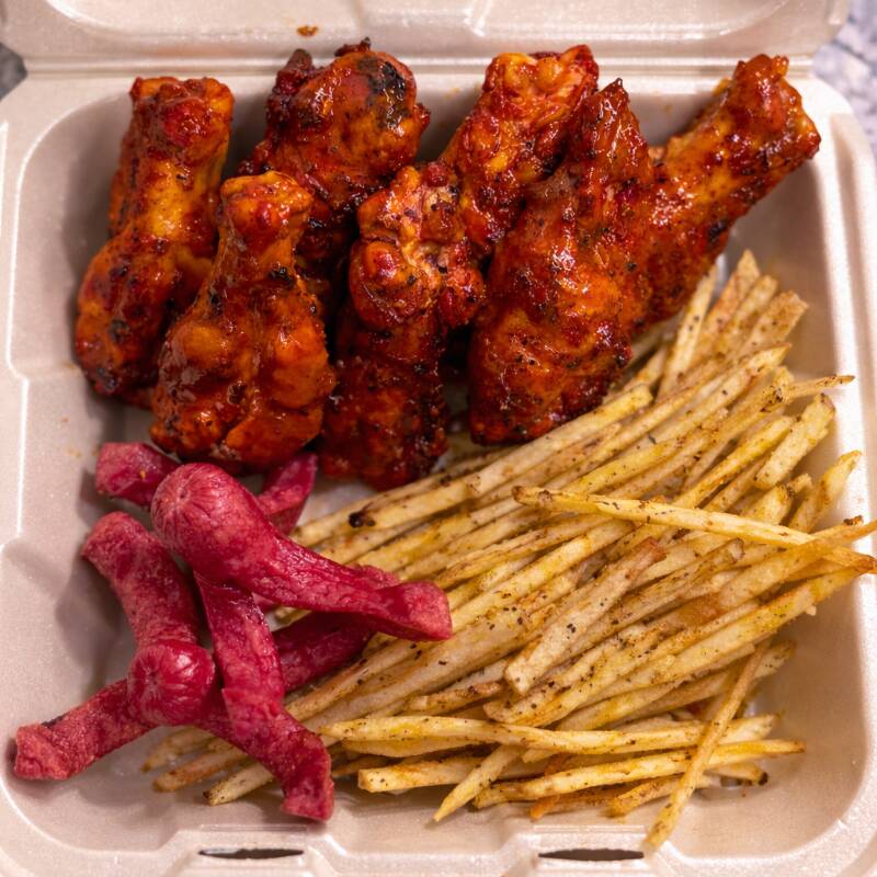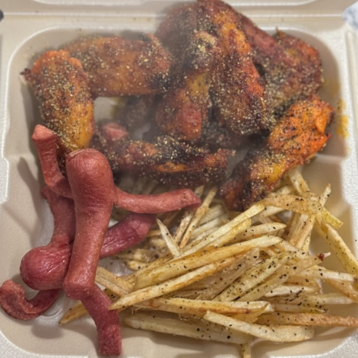 6 De nuestras salchichas fritas al punto exacto de dorado, transformadas en crujientes pulpitos. Van montadas sobre una cama de papas a la francesa sazonadas y acompañadas de nuestra sal especial de la casa.